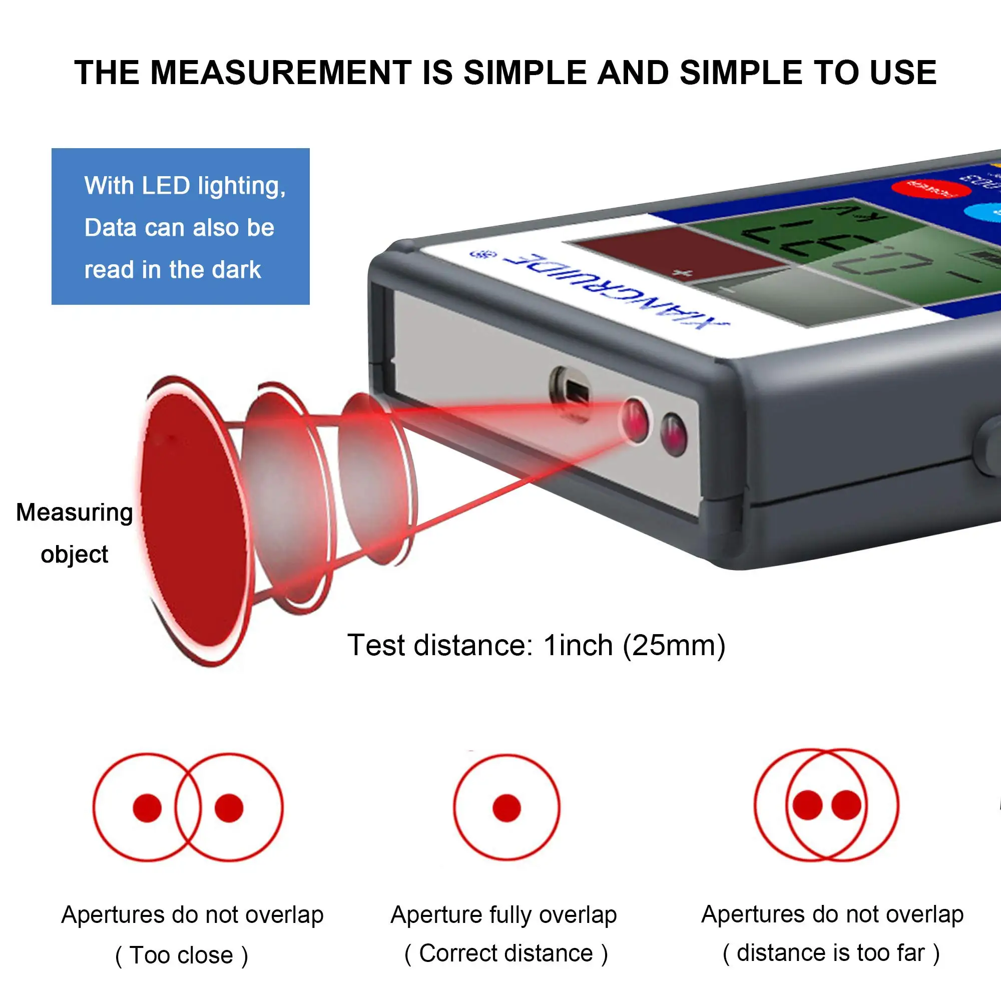 Einfach in 25mm Abstand zum Objekt halten bis die LED-Lichter sich treffen - schon siehst du den genauen Wert. Mit 10% Genauigkeit und 5 Messungen pro Sekunde bekommst du zuverlässige Ergebnisse.