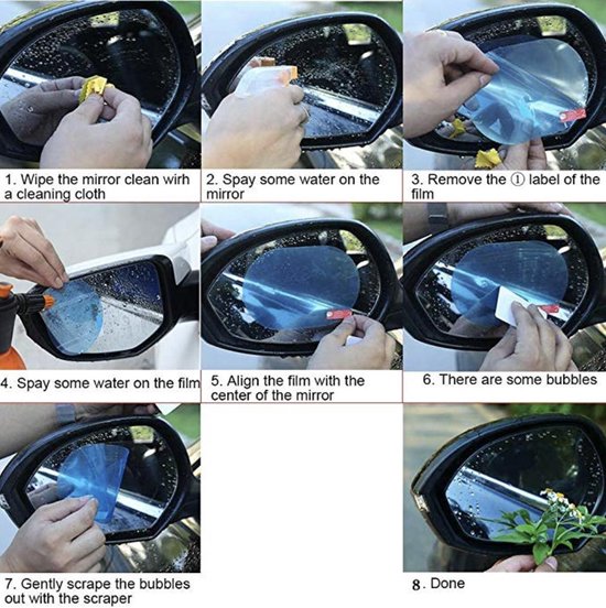 Klarer Durchblick bei jedem Wetter! Diese speziellen Nano-Beschichtungsfolien sorgen für perfekte Sicht an regnerischen und nebligen Tagen. Im Set: 4x Rückspiegelfolien (13,5x9,5cm) und 2x Seitenscheibenfolien (20x17,5cm). Die PET-Folie mit 99% Lichtdurchlässigkeit verhindert Beschlag, Blendung und lässt Wassertropfen einfach abperlen. Einfache Montage mit beiliegenden Werkzeugen - innerhalb von 30 Minuten korrigierbar. Für die meisten Autos, Busse und LKWs geeignet. Mehr Sicherheit durch bessere Sichtverhältnisse!