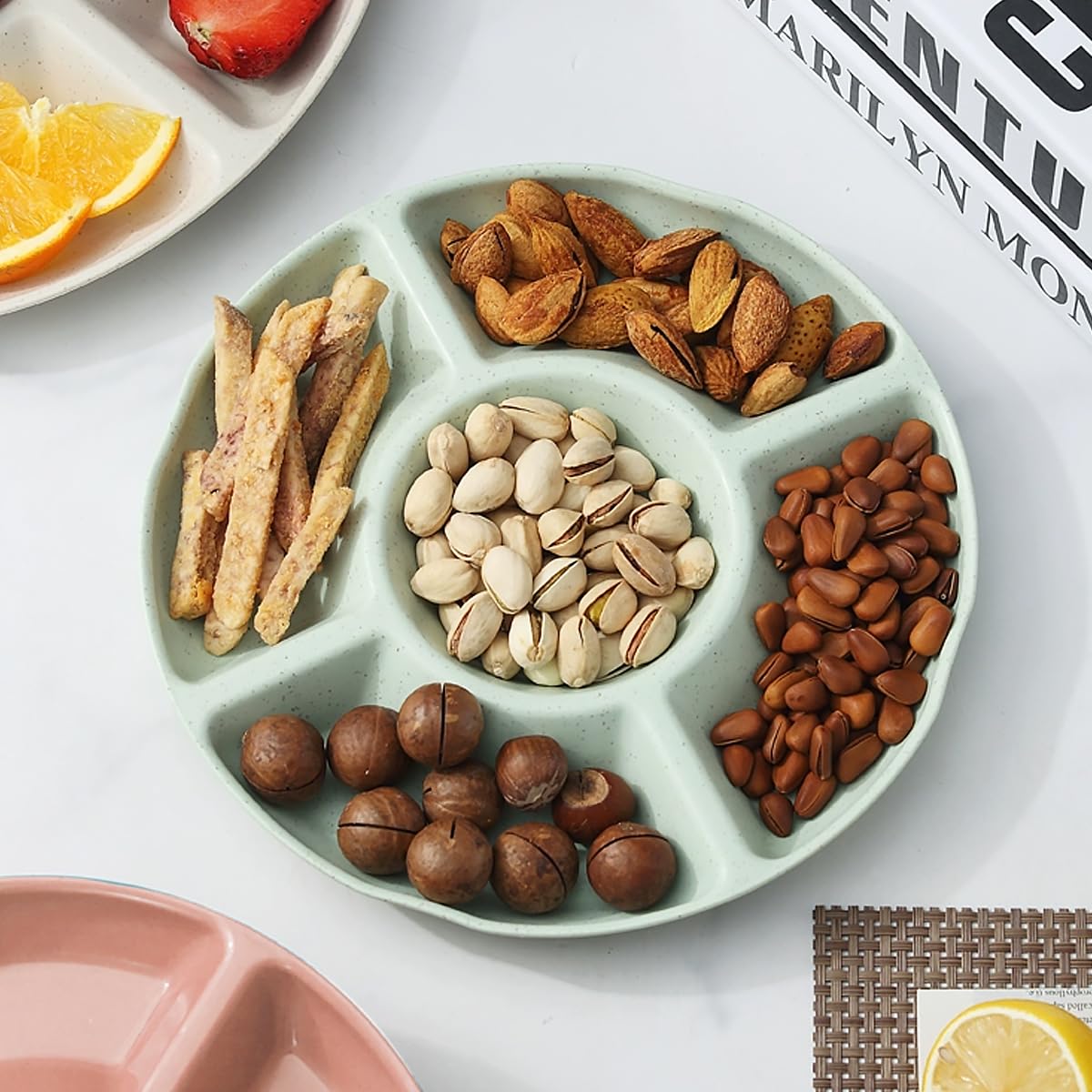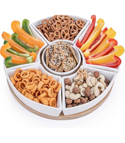 Total praktisch für Partys und Familienfeiern! Dieses 4er Set Snackteller hat jeweils 5 Fächer - perfekt um verschiedene Snacks getrennt zu servieren. So vermischen sich die Aromen nicht und alles bleibt knackig frisch! In hübschen Blütenformen und Farben: Beige, Rosa, Grün und Blau - für jeden Geschmack etwas dabei. Der Anti-Rutsch-Boden sorgt dafür, dass nichts verrutscht - auch nicht bei lebhaften Feiern! Aus hochwertigem Kunststoff - spülmaschinenfest und wiederverwendbar. Mit 22,5cm Durchmesser ideal für Nüsse, Chips, Süßigkeiten, Obst oder Dips. Super für Kindergeburtstage, Grillpartys, Filmabende oder einfach so! Leicht zu reinigen - einfach in die Spülmaschine und fertig. Spart Geschirr und sieht dabei noch dekorativ aus! Macht jedes Buffet übersichtlicher und ansehnlicher. Einfach befüllen und servieren - deine Gäste werden begeistert sein! Praktischer geht's kaum!