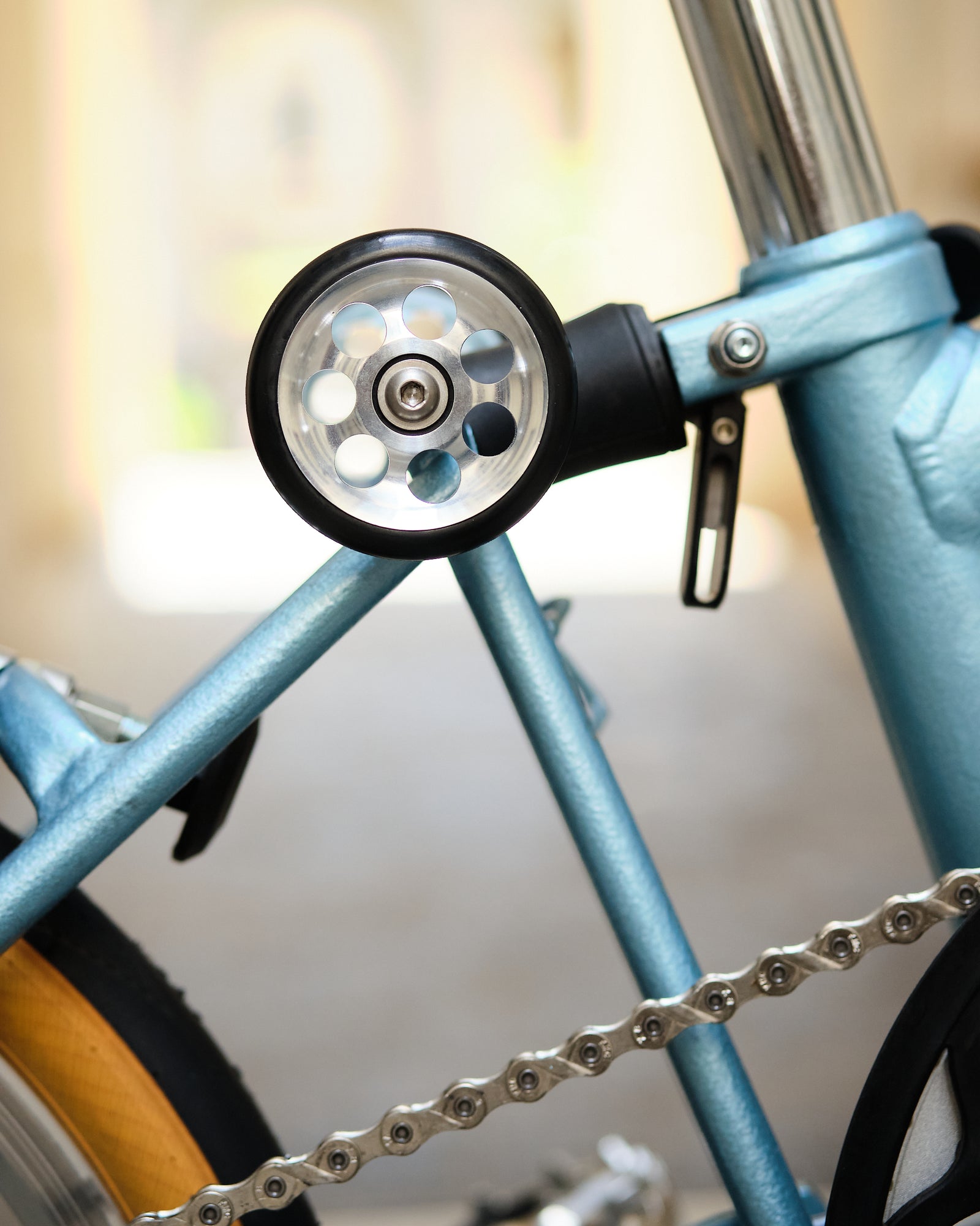 Mega praktisch für dein Brompton-Faltrad! Diese Easy Wheels aus leichter Aluminium-Legierung machen das Schieben und Manövrieren deines zusammengeklappten Rades zum Kinderspiel. Mit 60mm Durchmesser und nur 47g Gewicht pro Rad sind sie der ultimative Komfort-Upgrade. Das hohle Design spart zusätzliches Gewicht, ohne an Stabilität zu verlieren. Die Gummireifen schonen den Boden und sorgen für guten Grip. Einfache Installation mit mitgelieferter M6-Schraube - in wenigen Minuten montiert. Speziell entwickelt für Brompton-Falträder und deren Gepäckträger. Aus hochwertigem CNC AL7075 Material gefräst - extrem stabil und langlebig. Perfekt für den täglichen Gebrauch, ob auf dem Weg zur Arbeit oder auf Reisen. Mach dein Faltrad noch alltagstauglicher mit diesem smarten Zubehör! Ein kleines Teil, das einen großen Unterschied macht.