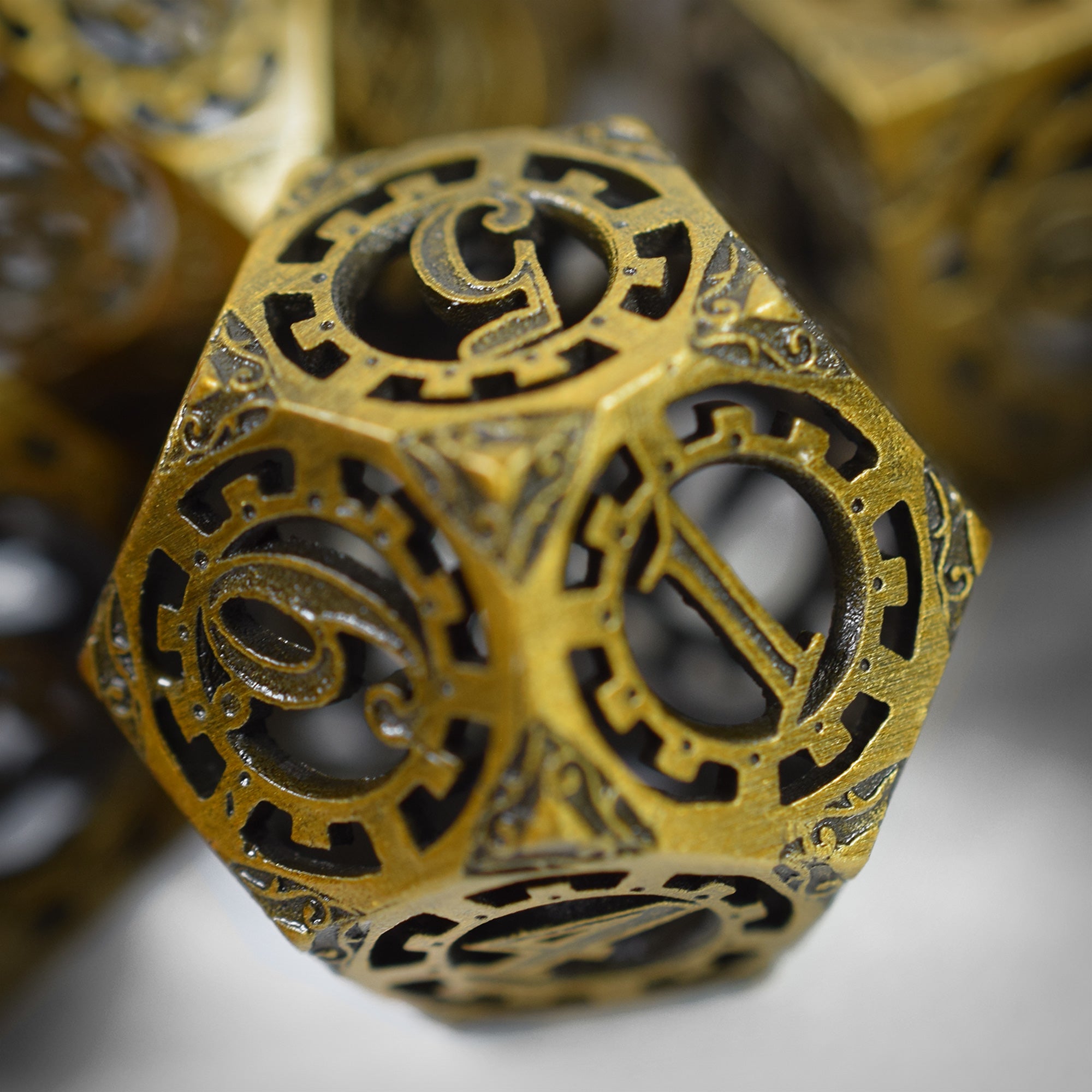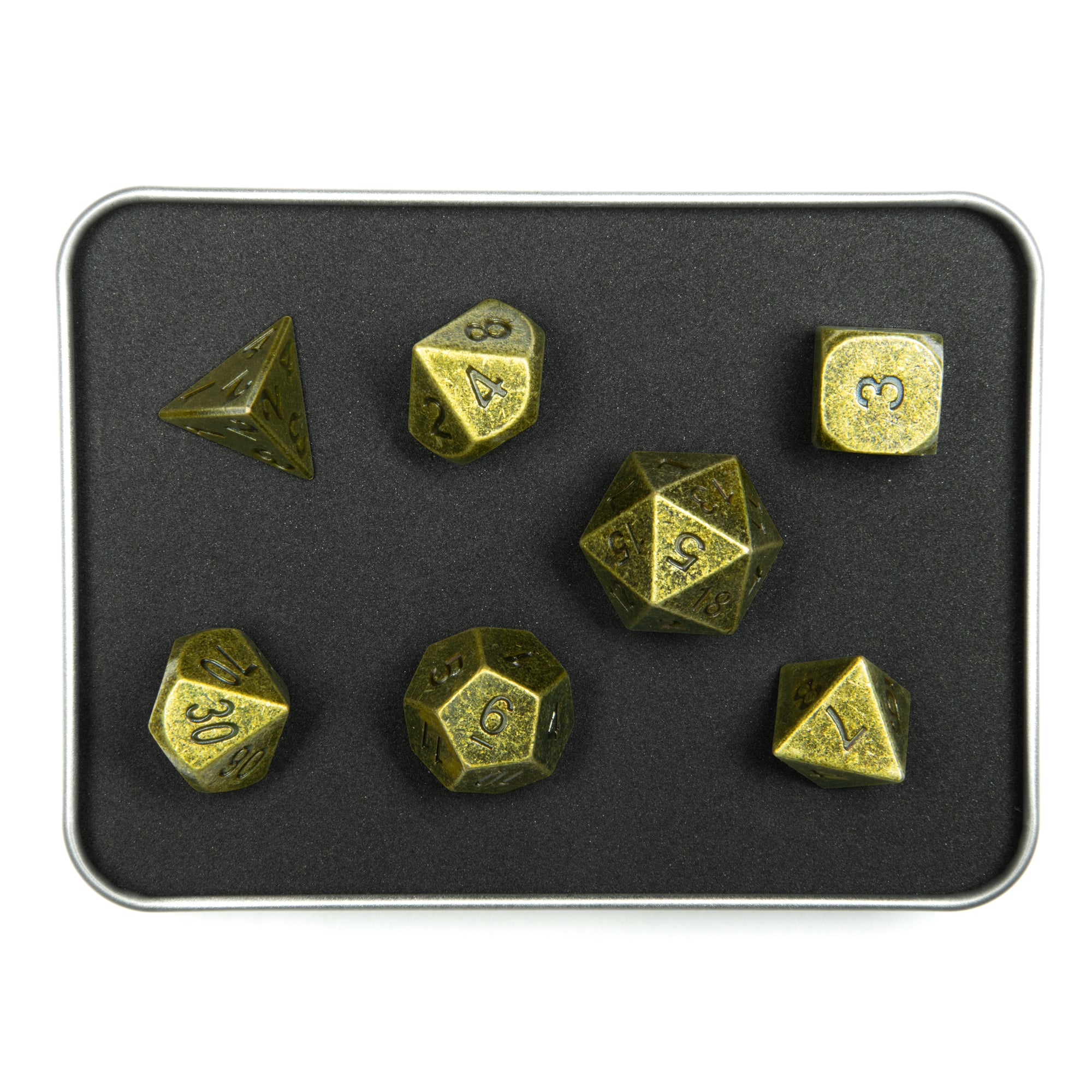 Boah, diese Metallwürfel sehen einfach nur krass aus! Das Dolch-Design ist ins jede Zahl eingraviert und gibt dir das Gefühl, echt Bonuskräfte beim Würfeln zu kriegen. Das komplette Set wiegt stolze 149 Gramm - die Teile liegen richtig satisfaktisch in der Hand.\n\nIm Set sind alle 7 wichtigen Würfel für D&D und andere Rollenspiele dabei. Die Zahlen sind trotz des coolen Designs super gut lesbar. Und die metallene Aufbewahrungsbox ist einfach nur premium - perfekt um deine Würfel sicher zu transportieren.\n\nKleiner Tipp: Nimm besser einen Würfelturm oder weiche Unterlage, denn auf harten Flächen könnten die Würfel Schaden nehmen. Aber keine Sorge, wir checken jeden Würfel vor dem Versand persönlich! 30 Tage Rückgaberecht und 24 Monate Garantie inklusive. Deine Mitspieler werden neidisch sein, versprochen!
