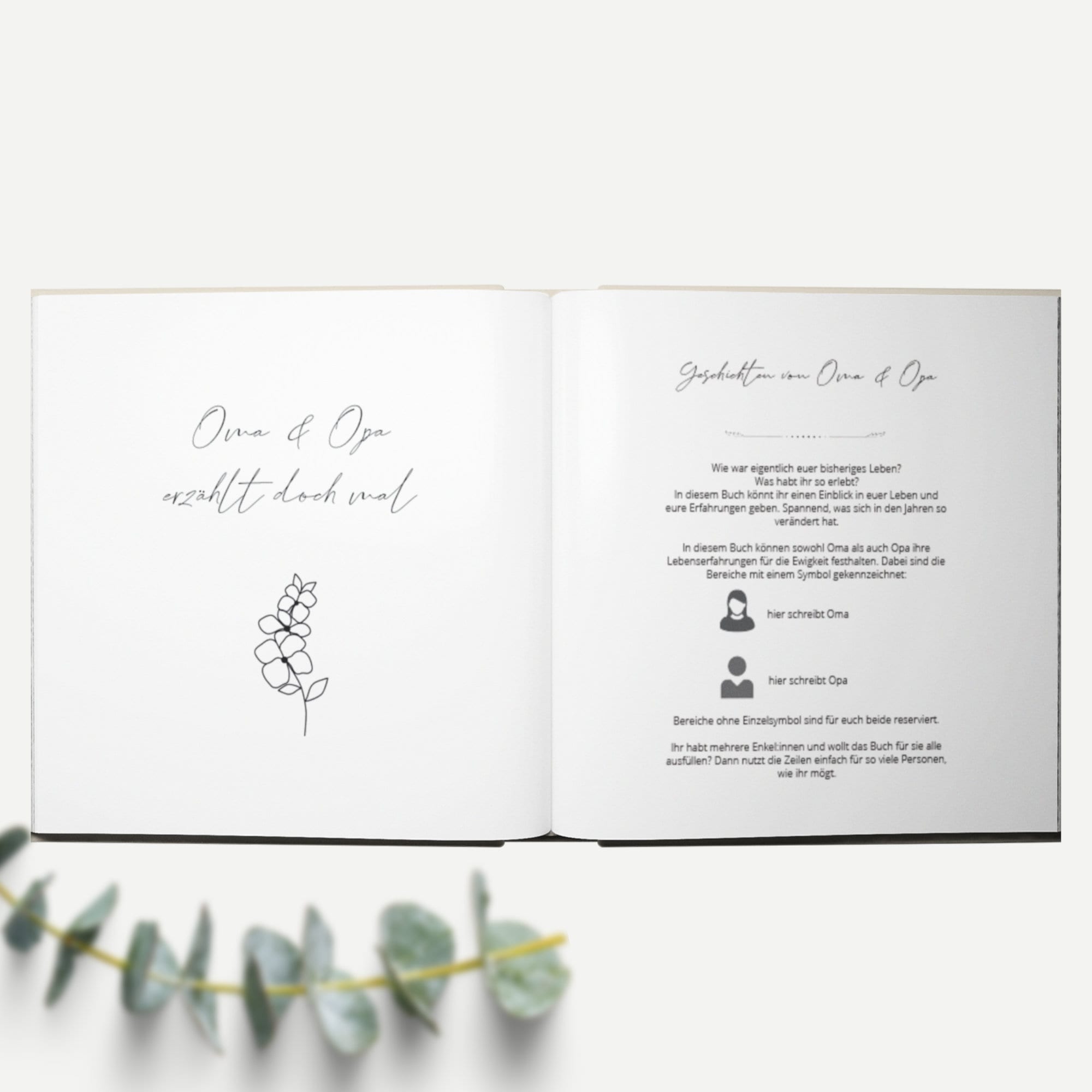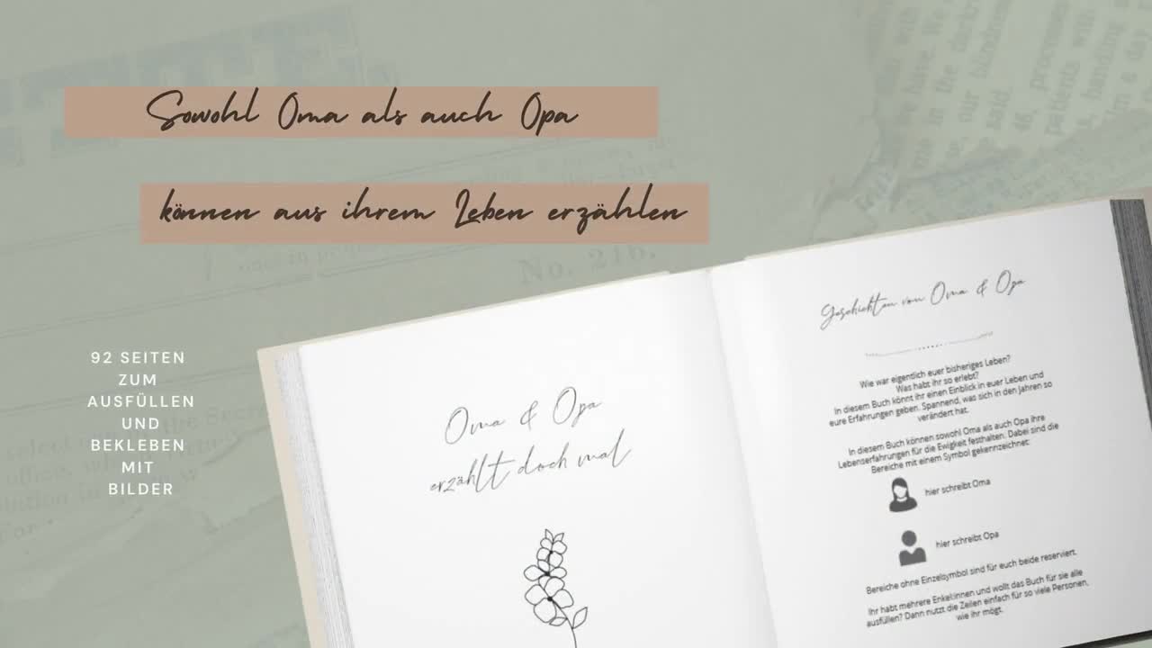 Das perfekte Geschenk für Oma und Opa! Dieses wunderschöne Erinnerungsbuch hilft Großeltern, ihre Lebensgeschichte für die Enkelkinder festzuhalten. Mit 92 Seiten voller spannender Fragen zu Kindheit, Jugend, Beruf und natürlich der Zeit als Großeltern. Lückentexte, Ankreuzmöglichkeiten und viel Platz für Fotos machen das Ausfüllen zum Vergnügen. Hochwertiges 120g/m² Papier und edles Hardcover in Beige - das Buch wird zur wertvollen Familienerinnerung. Perfekt zur Geburt des Enkelkindes, zu Weihnachten oder einfach so. Maße: 21x21 cm - handlich aber mit viel Platz. Mach deinen Großeltern eine Freude und schenk ihnen die Möglichkeit, ihre Geschichte für die Ewigkeit zu bewahren! Wird in NRW mit Liebe produziert.