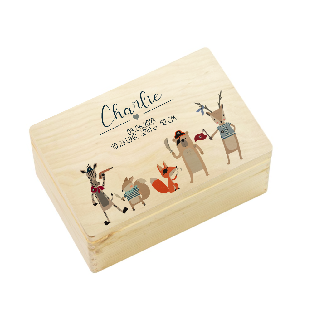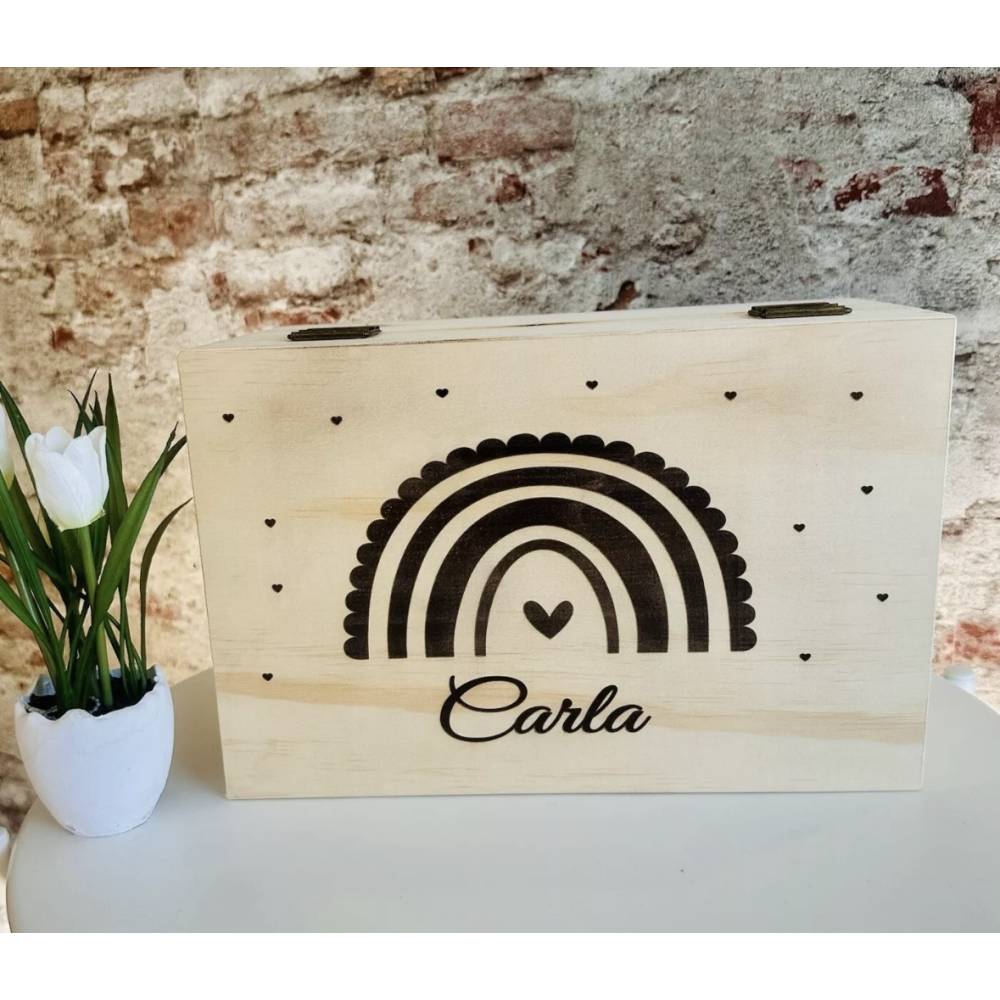 Das Besondere: Lässt sich mit Namen und Geburtsdaten des Kindes personalisieren. Wählbare Motiven für Mädchen und Jungen. Jede Kiste ein Unikat!