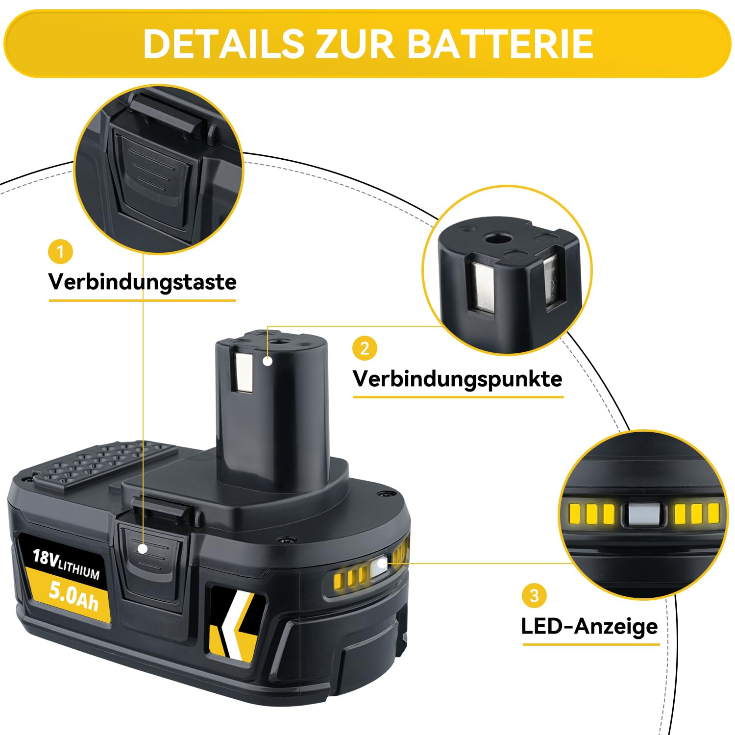 Leistungsstarke Ersatzakkus für deine Ryobi 18V Geräte! 2 Stück 5,5Ah Lithium-Ionen Akkus mit LED-Ladeanzeige. Kompatibel mit Ryobi P108, RB18L50, RB18L40, RB18L25, BPL18151 und vielen weiteren 18V Modellen. Passt zu originalen Ryobi Werkzeugen und Ladegeräten. Mit Schutz vor Überladung, Tiefentladung, Kurzschluss und Überhitzung. Kein Memory-Effekt - jederzeit aufladbar. Einfach Leistung prüfen durch Knopfdruck. Inklusive 30 Tage Geld-zurück und 12 Monate Garantie. Doppelte Power für deine Projekte!