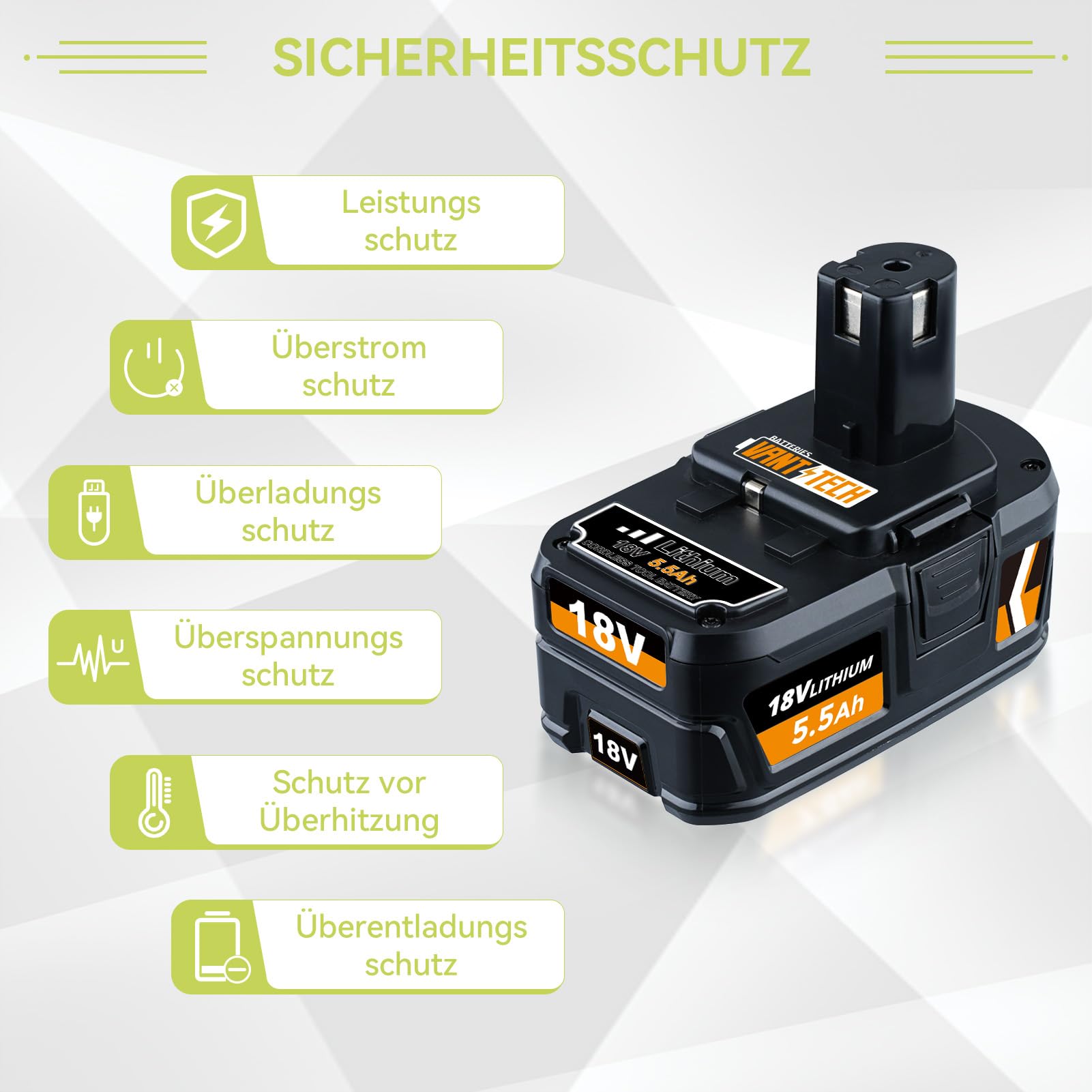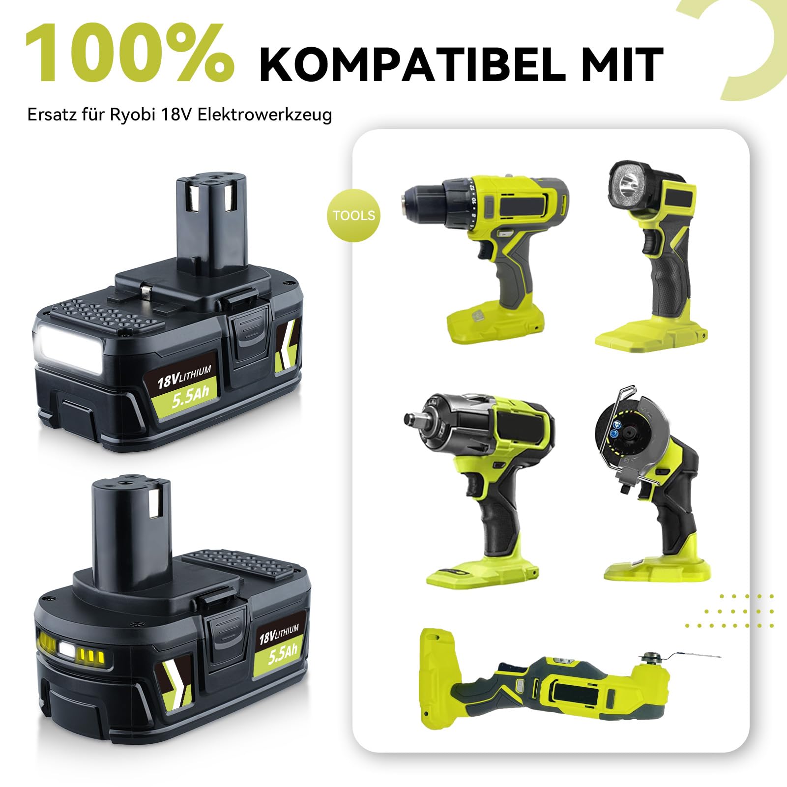 2 Stück 5,5Ah Ersatzakku Für Ryobi 18V - Kompatibel Mit P108, RB18L50 Werkzeugen