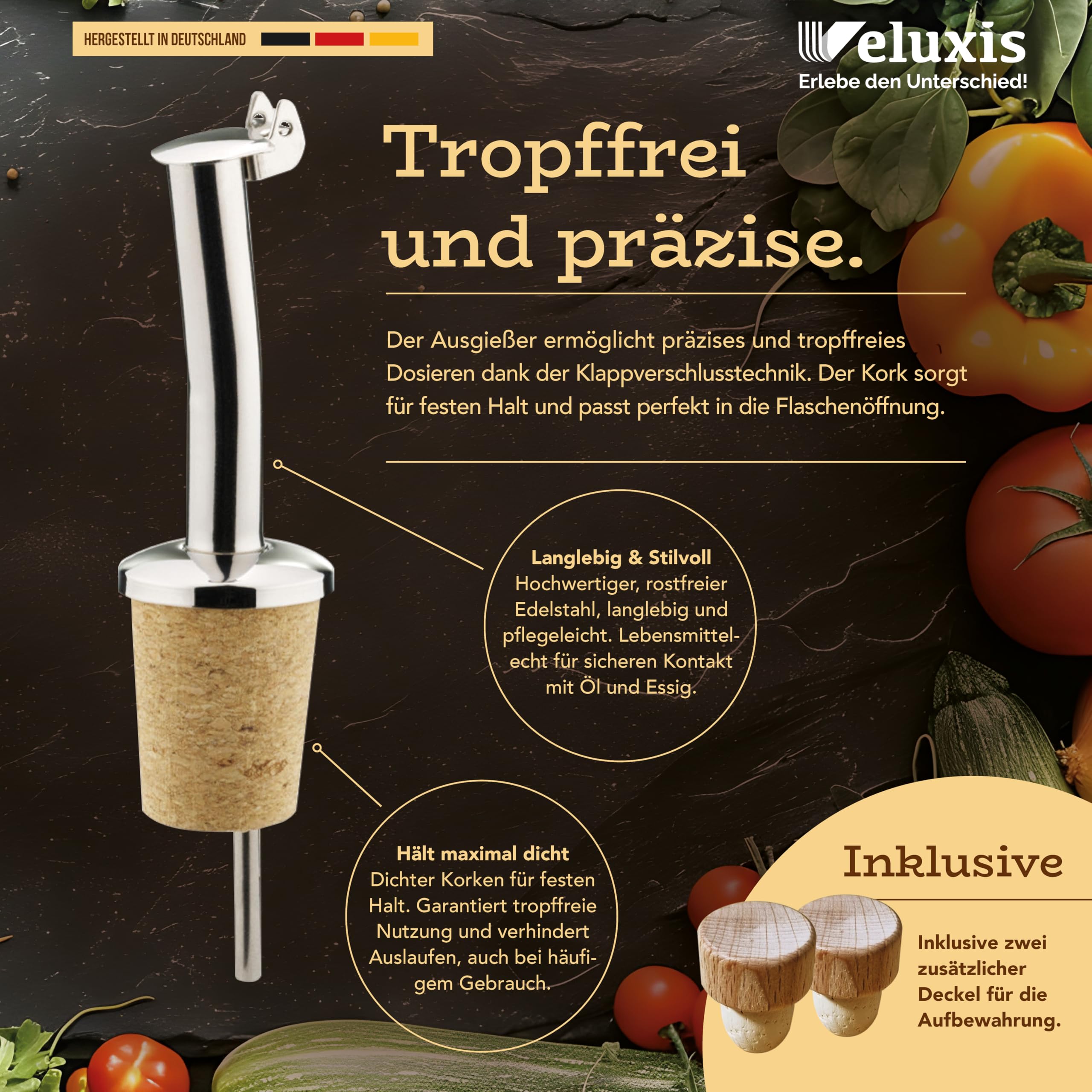 Stilvoll und praktisch zugleich! Dieses Veluxis Flaschen-Set besteht aus zwei 500ml Feinsteinzeug-Flaschen, die sich perfekt für Öl, Essig oder Saucen eignen. Der tropffreie Ausgießer sorgt für sauberes Dosieren ohne Kleckern. Hergestellt in Deutschland garantiert beste Qualität und Langlebigkeit. Der integrierte UV-Schutz bewahrt den Inhalt vor Lichtschäden. Die Flaschen sind spülmaschinenfest und damit super pflegeleicht. Das elegante Design macht sich in jeder Küche gut - ob auf dem Esstisch oder der Arbeitsplatte. Perfekt als Geschenk für Hobbyköche oder alle, die Wert auf stilvolles Tischzubehör legen. Die beiden Ersatzdeckel sind ein praktisches Extra. Mit den Maßen von 500ml sind die Flassen groß genug für den täglichen Gebrauch, aber nicht zu klobig. Einfach befüllen, aufstellen und sich an der praktischen und dekorativen Lösung erfreuen. Deutsche Wertarbeit, die begeistert!