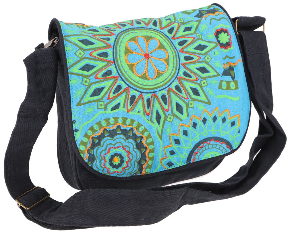 GURU SHOP Ethno Schultertasche Aus Nepal - Blau/braun Mit Lederapplikationen