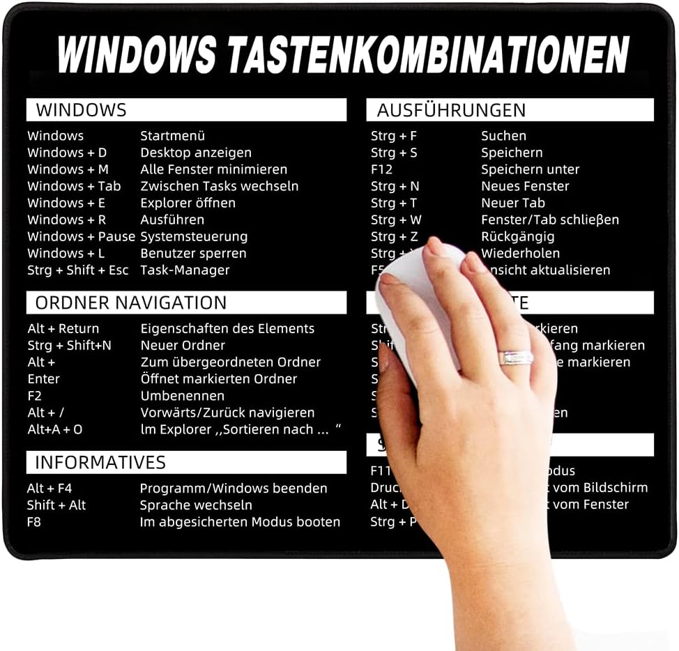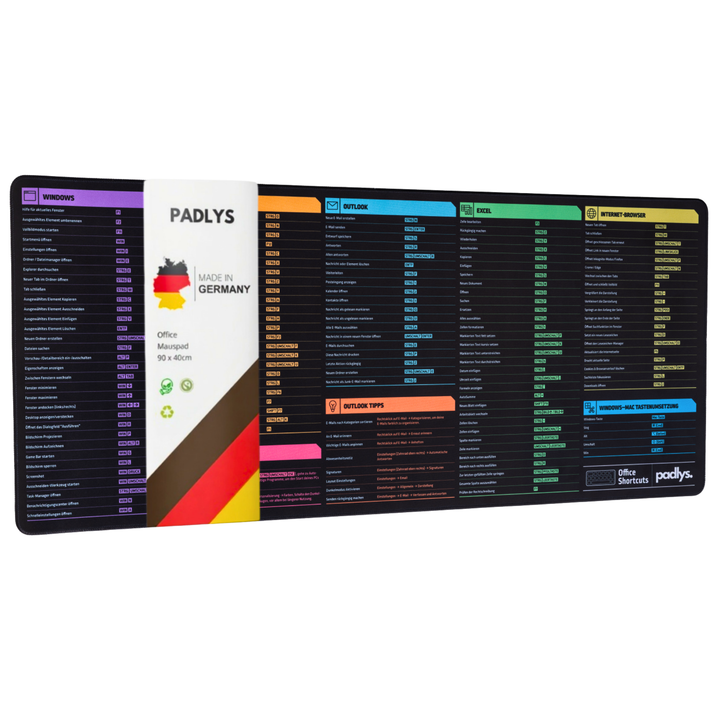 Bist du genervt vom ständigen Suchen nach Excel-Shortcuts? Diese XXL Schreibtischunterlage mit allen wichtigen Tastenkombinationen ist dein Retter im Büro-Alltag! Mit 800x300mm bietet sie genug Platz für Tastatur und Maus. Alle deutschen Shortcuts für Excel, Word, Windows und PowerPoint auf einen Blick - kein lästiges Googeln mehr! Die 3mm dicke Gummibasis liegt rutschfest auf dem Tisch und schont deine Handgelenke. Die Oberfläche aus hochwertigem Gewebe ermöglicht präzise Mausbewegungen. Die Kanten sind sauber verarbeitet und kräuseln sich nicht. Perfekt für Büro, Homeoffice oder Studium - damit wirst du zum Office-Profi! Spart Zeit und Nerven - endlich alle wichtigen Befehle immer im Blick!