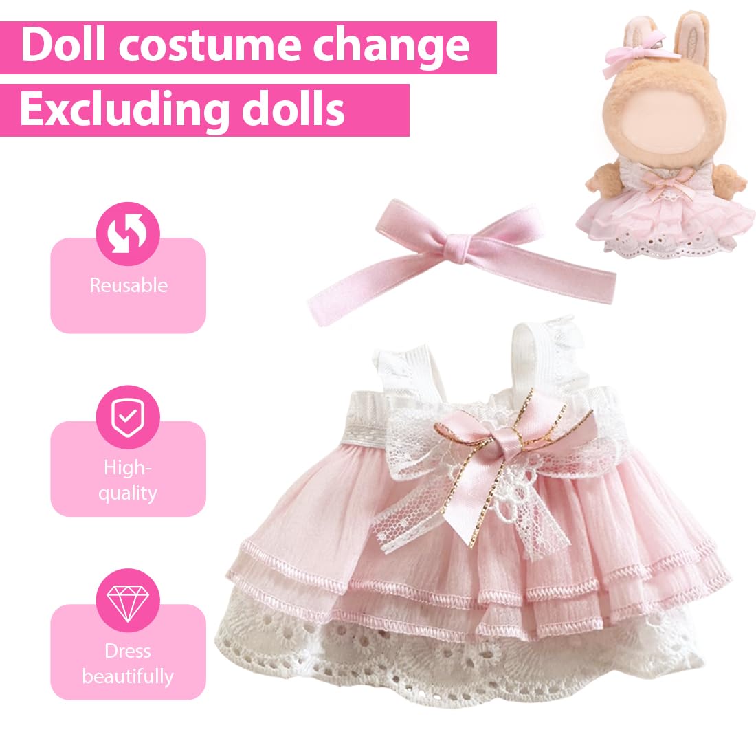 JAWUZ Puppenkleidung Für 17cm Labubu - Rosa Kleid Mit Haarschleife Set