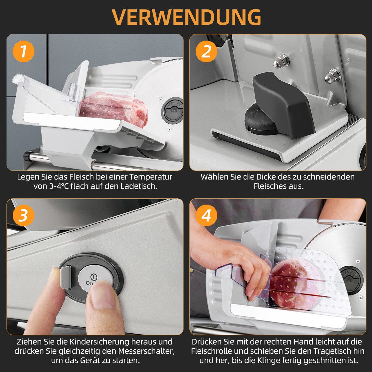 Perfekte Scheiben jedes Mal! Dieser 250W Allesschneider macht das Schneiden zum Kinderspiel. Mit 3 Edelstahl-Klingen: 2 gezackte für Brot und 1 glatte für Wurst und Käse. Die Schnittdicke ist von 0-15mm stufenlos verstellbar - ob hauchdünne Aufschnitt oder dicke Brotscheiben. Der starke Motor meistert alles: Brot, Wurst, Schinken, Käse - einfach durchschieben und perfekte Scheiben erhalten. Besonders sicher mit Verriegelung - ideal für Familien mit Kindern. Die abnehmbare Schneideplattform macht die Reinigung super einfach. Einfach unter fließendem Wasser abspülen, fertig. Perfekt für große Familien, Feinschmecker oder alle, die gerne kochen. Macht das Frühstück vorbereiten zum Vergnügen. Einfach einschalten, Dicke einstellen und los schneiden - professionelle Ergebnisse für deine Küche!