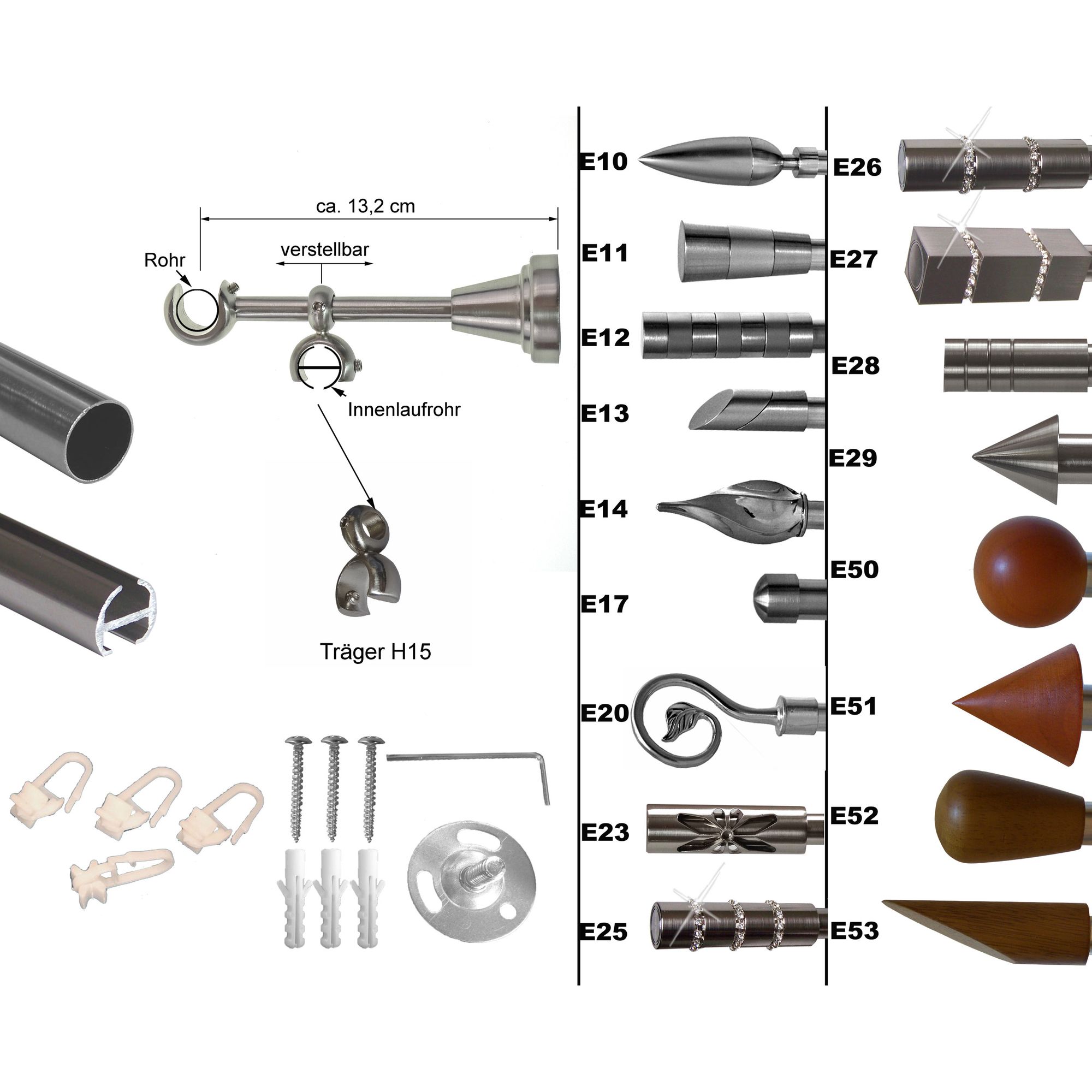 Du willst Vorhänge von der Decke hängen? Mit diesen 4 Edelstahl-Haltern wird das zum Kinderspiel! Robust, rostfrei und super einfach zu montieren.\\n\\nTechnische Daten:\\n• Für Rohrdurchmesser: 25mm\\n• Gesamtlänge: 200mm\\n• Material: Hochwertiger Edelstahl\\n• Farbe: Schwarz\\n• Lochabstand: 52mm\\n\\nIm Lieferumfang:\\n• 4x Gardinenstangenhalter\\n• 8x Expansionschrauben\\n• 4x dekorative Abdeckungen\\n\\nBesondere Features:\\n• 2-Wege-Montage: Decke ODER Wand\\n• Verstellbare Festigkeit - hält bombenfest\\n• Geglättete Oberfläche - sicher und leicht zu reinigen\\n• Hohe Tragkraft - für schwere Vorhänge\\n\\nPerfekt für Vorhänge, Raumteiler oder Kleiderschrank-Stangen. Einfach Schrauben in die Löcher drehen - fertig ist die professionelle Installation!