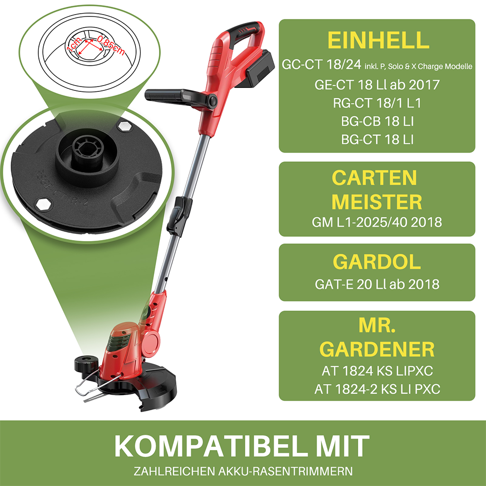 Hey, wenn dein Einhell Rasentrimmer nicht mehr richtig schneidet, bist du hier genau richtig! Dieses Set mit 1 Schneidebrett und 4 Metall-Klingen in Grün (90mm) passt perfekt für GE-CT 18 LI Modelle ab 2017, aber auch für GC-CT18/24, Solo KS LiP XC und Gartenmeister GM LI-2025/40. Die Klingen sind aus robustem Metall und halten richtig lange - kein Vergleich zu diesen billigen Plastikteilen! Der Austausch ist super einfach: Einfach die mittlere Schraube lösen, altes Teil raus, neues rein und schon schneidet dein Trimmer wieder wie neu. Besonders praktisch für verschiedene Rasenflächen - ob feiner Rasen oder etwas wilderes Gras. Mit den scharfen Klingen geht die Arbeit viel schneller von der Hand. Und bei 4 Ersatzklingen hast du auch gleich für die nächste Saison vorgesorgt. Einfach bestellen, einbauen und sich über den perfekten Rasen freuen!
