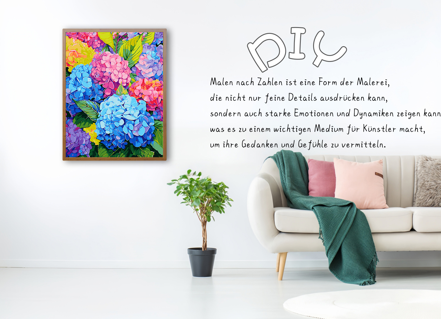 Entdecke den Künstler in dir! Dieses komplett Malen nach Zahlen Set bringt Entspannung und kreative Freude in dein Leben. Auf der 40x50 cm großen Leinwand wartet ein wunderschönes Blumen-Motiv darauf, von dir zum Leben erweckt zu werden. Alles ist enthalten: 3 verschiedene Pinsel, Acrylfarben, Aufhänger und eine detaillierte Anleitung. Einfach die nummerierten Flächen mit den passenden Farben ausmalen - und nach und nach entsteht dein persönliches Kunstwerk! Perfekt zum Abschalten nach einem stressigen Tag oder als kreatives Hobby. Das fertige Bild ist eine tolle Dekoration für dein Zuhause oder ein besonderes Geschenk für liebe Menschen. Auch für Anfänger super geeignet - probier's aus!