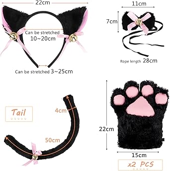 Verwandele dich in eine niedliche Katze! Dieses komplette Katzenkostüm-Set enthält alles was du brauchst: flauschiges Katzenohren-Stirnband, Schwanz, Handschuhe mit Krallen und einen süßen Glöckchen-Kragen mit Schleife. Aus weichem Stoff der angenehm auf der Haut liegt. Das elastische Design passt sich jeder Figur an - ob für Frauen oder Teenager. Perfekt für Halloween-Partys, Cosplay-Events, Mottotage oder einfach nur für lustige Fotos. Siehst du niedlich aus und bringst garantiert alle zum Lächeln! Einfach anziehen und der Star der Party werden!