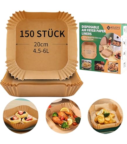 120 runde Backpapiere speziell für deine Heißluftfritteuse! Mit 20cm Durchmesser passen sie perfekt in die meisten Modelle von Philips, Cosori, Ninja und anderen (4,5-8L Körbe). Aus umweltfreundlichem Naturzellstoff ohne BPA oder Fluorchemikalien. Die 4,5cm hohen Ränder verhindern Auslaufen - kein lästiges Putzen mehr! Hält Temperaturen bis 220°C stand und ist ölfest. Einfach reinlegen, backen und entsorgen. Spart Zeit und Nerven - und deine Fritteuse bleibt blitzsauber. Für knusprige Pommes, Fischstäbchen und vieles mehr!