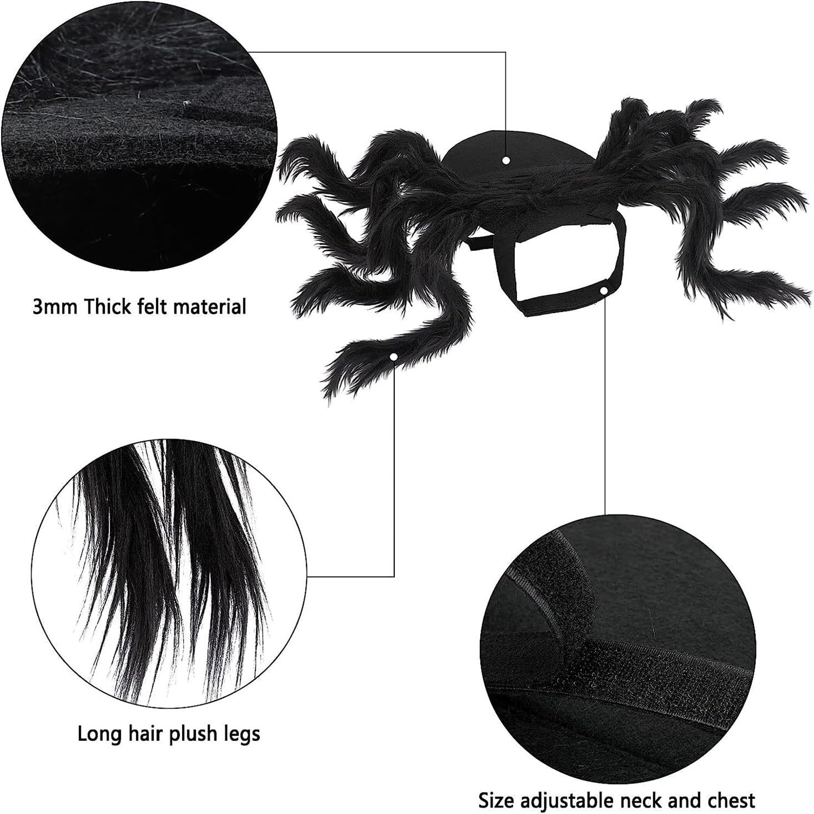 Oh mein Gott, wie süß ist das denn? Dein Hund oder deine Katze als gruselige Spinne! Mit acht realistischen Fellbeinen wird dein Haustier zum absoluten Hingucker auf der Halloween-Party. Aus weichem Filz und Langhaarplüsch, total bequem für deinen Liebling. Verstellbar von 33-53cm Halsumfang und 48-74cm Brustumfang - passt also den meisten Katzen und kleinen Hunden. Die Klettverschlüsse machen das Anziehen super einfach. Dein Tier wird alle Blicke auf sich ziehen und die Halloween-Stimmung perfekt machen. Einfach unschlagbar lustig!
