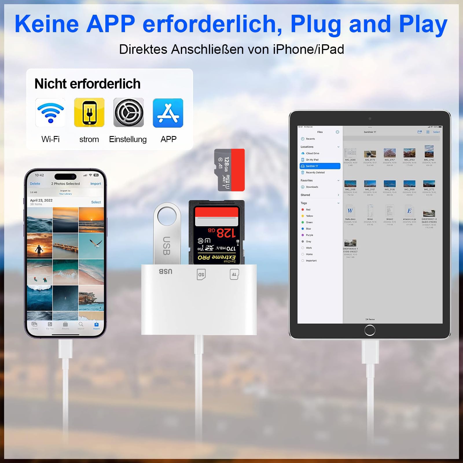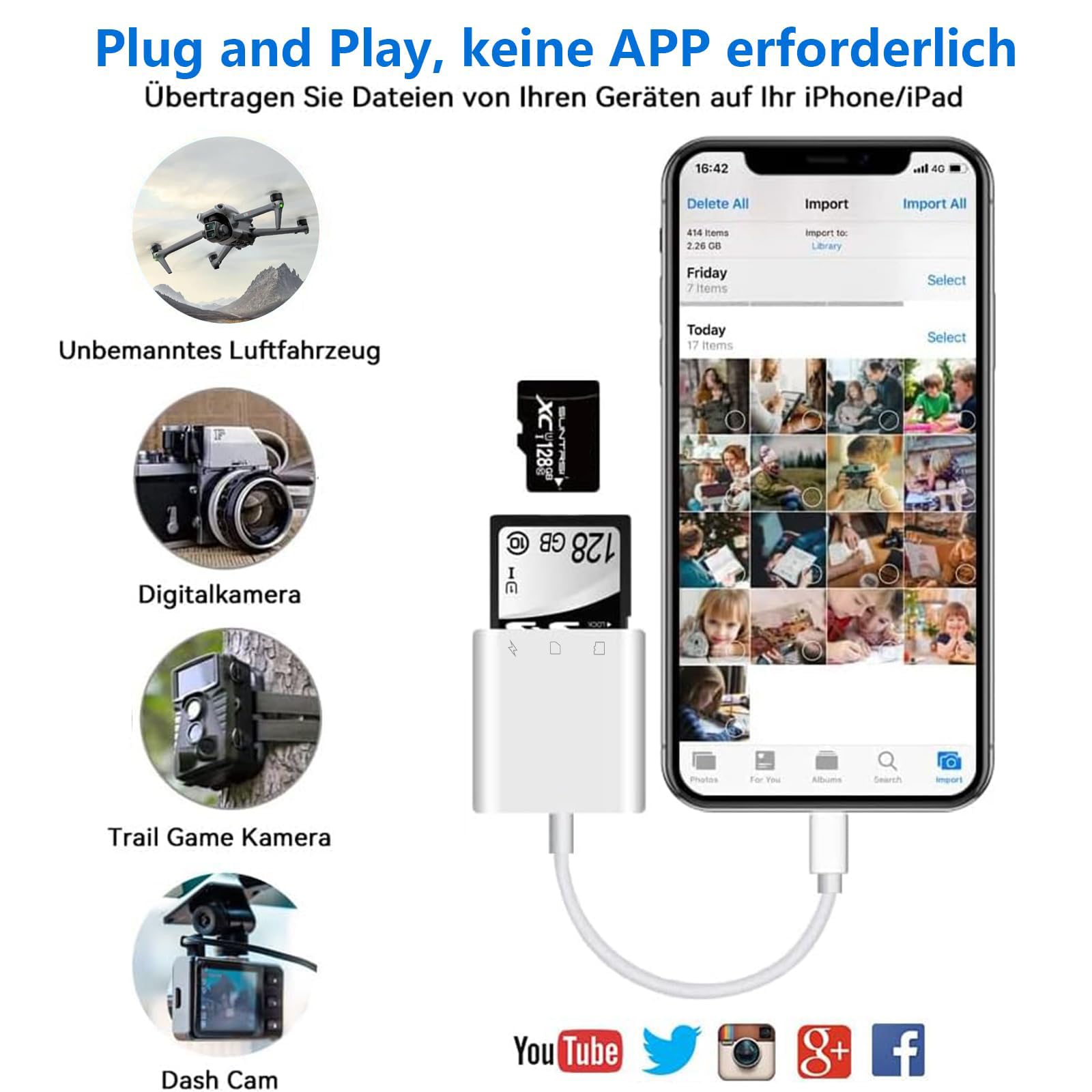 Mega praktisch - dieser 3-in-1 Kartenleser überträgt deine Fotos und Videos blitzschnell vom Handy! Er unterstützt SD, MicroSD und USB-Sticks gleichzeitig bis 256GB. Mit Übertragungsgeschwindigkeiten von 20-30 MB/s sind deine Dateien ruckzuck übertragen. Einfach einstecken und loslegen - keine App nötig! Funktioniert mit iPhone ab iOS 9.2 und iPad ab iOS 8.0. Ab iOS 13.0 sogar bidirektional - also sowohl vom Handy auf die Karte als auch umgekehrt. Perfekt für Fotografen, die ihre Kamera-Bilder schnell aufs Handy bringen wollen. Auch super für USB-Mäuse, Tastaturen oder MIDI-Controller. Ein echter Alleskönner!