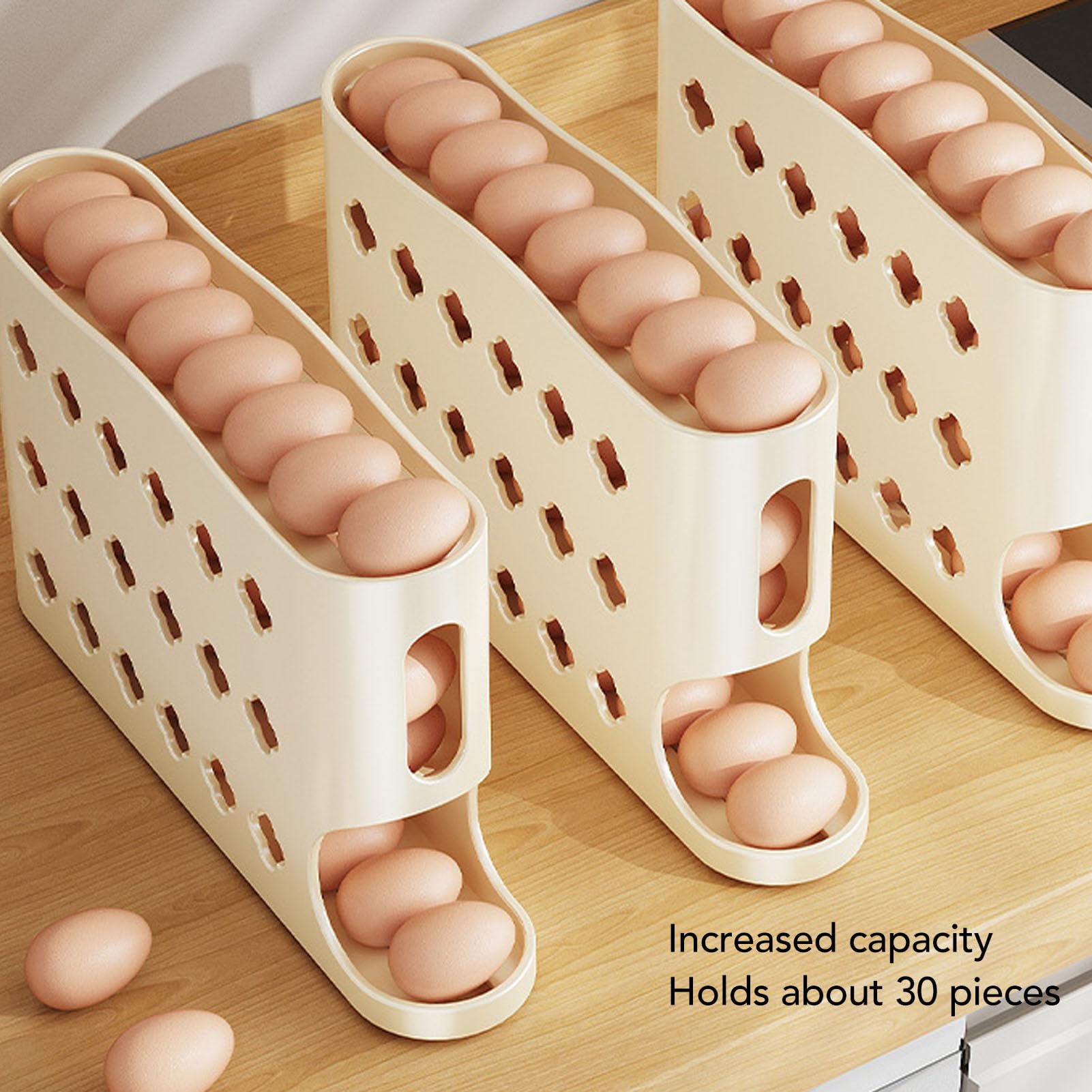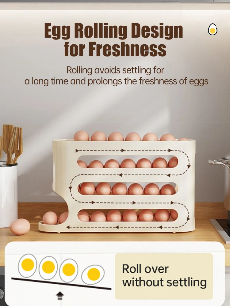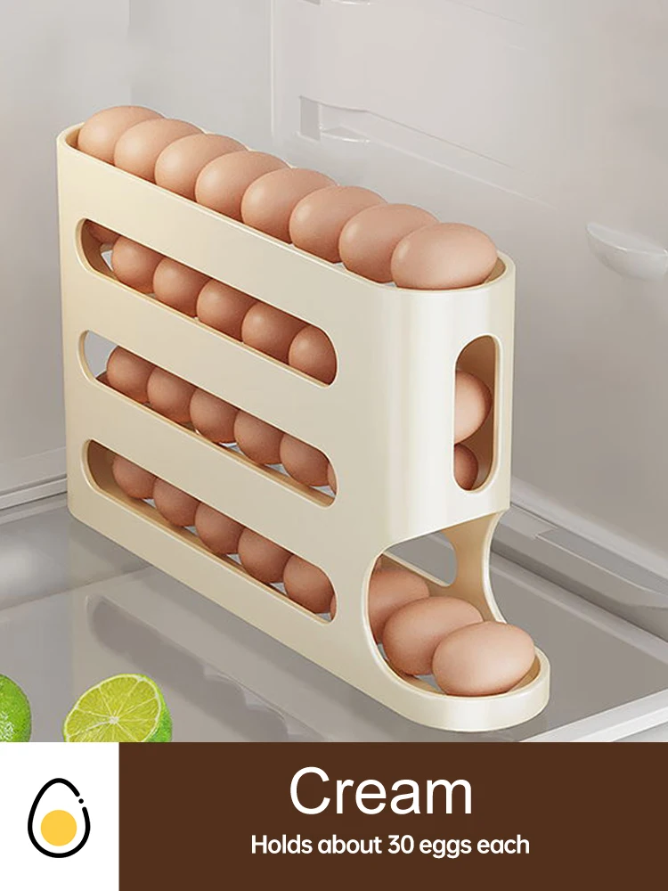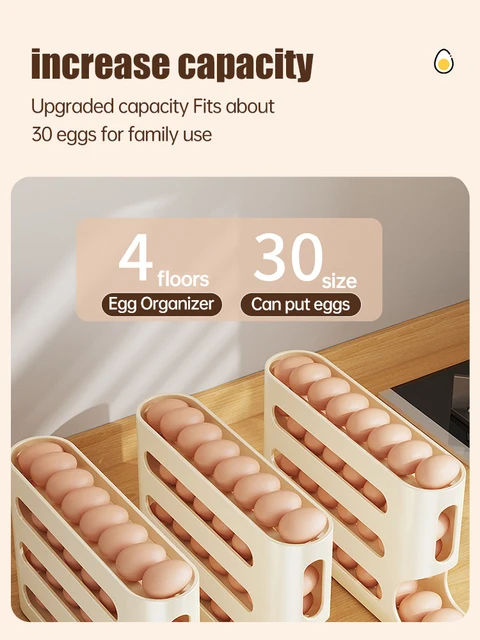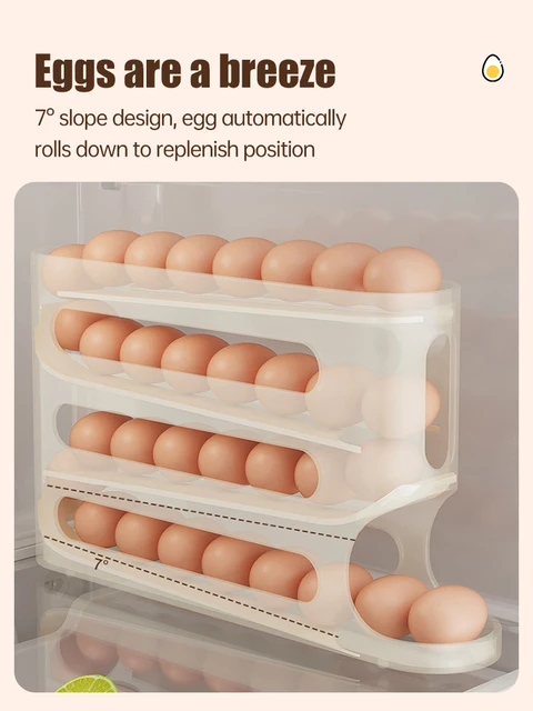 Schluss mit wackeligen Eierpackungen im Kühlschrank! Dieser clevere Eierhalter hat 4 Etagen und Platz für 30 Eier. Das automatische Roll-System sorgt dafür, dass immer das älteste Ei nach vorne kommt - First-In-First-Out Prinzip!