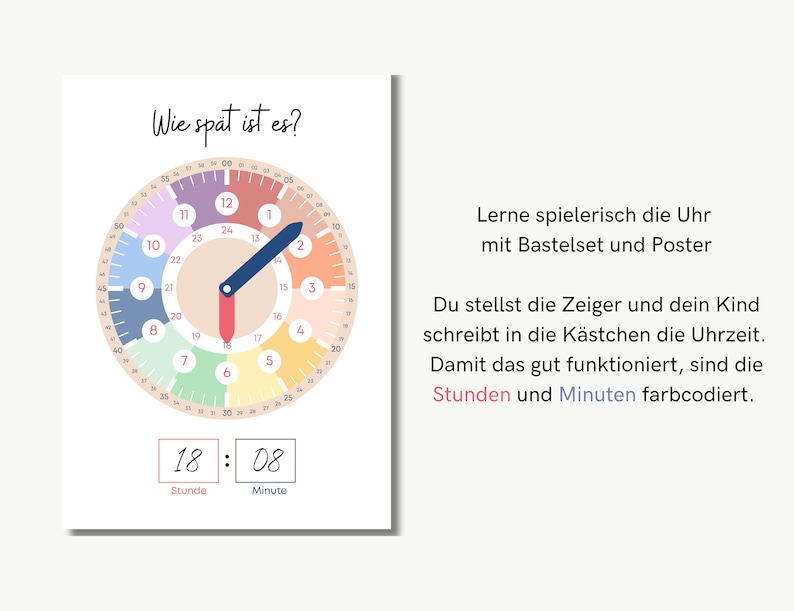 Dein Kind hat Probleme, die Uhrzeit zu lernen? Diese Montessori-Lernuhr macht es zum Kinderspiel! Mit ihren 10x10 cm ist sie perfekt für kleine Hände geeignet. Die bunten Zeiger bewegen sich wie bei einer echten Uhr - der Sekundenzeiger, Minutenzeiger und Stundenzeiger drehen sich gemeinsam. So verstehen Kinder spielerisch den Zusammenhang zwischen den Zeigern. Auf der Rückseite ist eine versteckte Halterung, damit die Uhr stabil auf dem Tisch steht. Aus sicherem PP-Material ohne scharfe Kanten. Die seitliche Rolle macht das Lernen noch interaktiver. Perfekt für Vorschulkinder oder Grundschüler, um ein erstes Zeitgefühl zu entwickeln. Das Spielzeug fördert nicht nur das Verständnis für die Uhrzeit, sondern auch Feinmotorik, logisches Denken und Konzentration. Ideal für zu Hause oder im Kindergarten. Ein pädagogisch wertvolles Geschenk, das Lernen zum Vergnügen macht und dein Kind optimal auf die Schule vorbereitet!