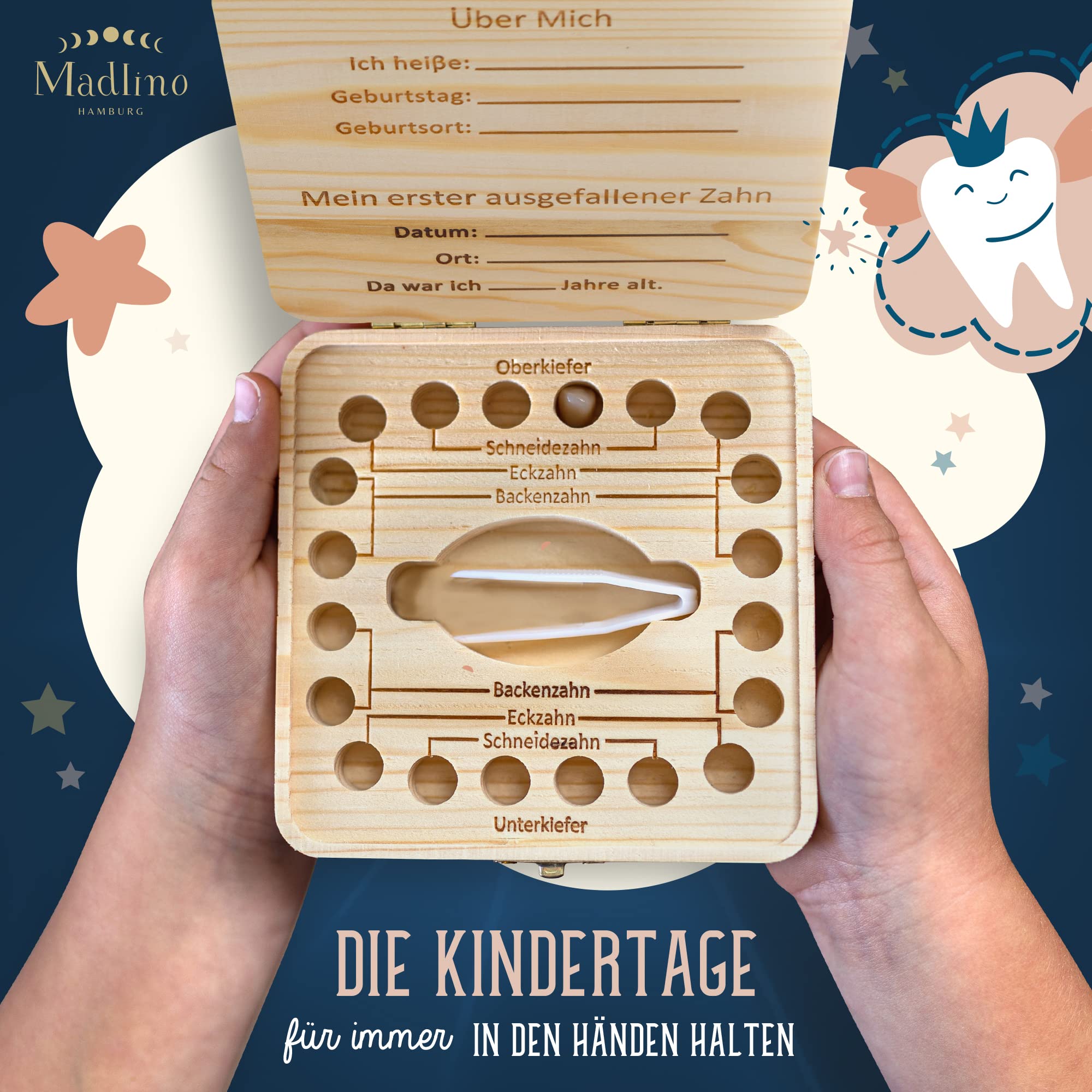 Bewahre die süßen Milchzähne deines Kindes in dieser entzückenden Holzdose auf! Mit niedlichem Feen-Motiv wird die Aufbewahrung der Zähne zu einem besonderen Ritual. Aus hochwertigem, wasserfestem Holz das lange hält. Einfach die Zähne vorher 5 Minuten in kochendem Wasser sterilisieren, etwas Watte in die Box legen und die Zähne sicher verwahren. Perfekt um Name, Geburtsdatum und Datum des Zahnverlusts zu notieren. Ein wunderbares Geschenk zur Taufe, zu Weihnachten oder zum Geburtstag - eine bleibende Erinnerung an die Kindheit deines Kleinen. Viel schöner als ein einfacher Briefumschlag!