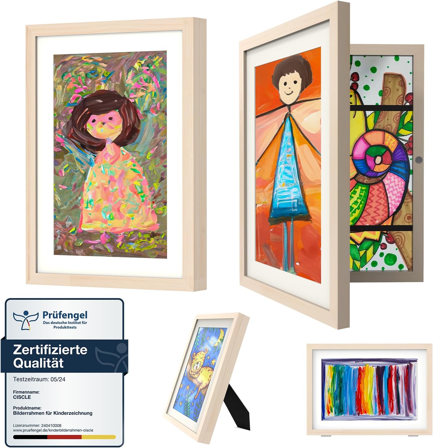 Der Hit für alle kleinen Künstler! Diese beiden A4 Bilderrahmen sind speziell für Kinderzeichnungen gemacht. Mit Magnetverschluss - öffnen wie ein Buch und das neueste Kunstwerk in Sekunden wechseln! \\n\\nSuper praktisch: Bis zu 150 Blätter passen in einen Rahmen! So kannst du die gesamte Kunst-Karriere deines Kindes in einem Rahmen bewahren. Die doppelten Gummibänder halten jedes Bild sicher fest. \\n\\nMaße: 32 x 24 cm - perfekt für Standard A4-Blätter. Aus hochwertigem MDF und mit Acrylglas - robust und sicher für Kinderhände. \\n\\nVielseitig einsetzbar: \\n- Im Kinderzimmer \\n- In der Kita \\n- Als Geschenk für Großeltern \\n- Für Schul-Projekte \\n- Im Home-Office \\n\\nAufhängen oder hinstellen - beides möglich! Die Metall-Scharniere öffnen 180 Grad, damit du bequem die Bilder wechseln kannst. \\n\\nPerfekt für: \\n- Gemälde \\n- Fotos \\n- Schulzeugnisse \\n- Urkunden \\n- Bastelarbeiten \\n\\nHol dir diesen praktischen Rahmen und zeig die Kunstwerke deines Kindes, ohne Löcher in die Wand zu machen oder Klebeband zu verwenden!