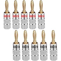 Endlich professionelle Klangqualität für deine Audioanlage! Diese 24k vergoldeten Bananenstecker aus hochwertigem Messing machen jeden Musikgenuss zum Erlebnis. Mit den beiden Stellschrauben befestigst du deine Lautsprecherkabel bis 7mm Durchmesser sicher und stabil - ganz ohne lästiges Löten. Die praktische Farbcodierung in zwei verschiedenen Farben hilft dir, die Polarität immer richtig im Blick zu behalten. Das schlanke, elegante Design in Vollmetall mit Carbon-Optik sieht nicht nur super aus, sondern sorgt auch für optimale Leitfähigkeit. Perfekt geeignet für deine HIFI-Anlage, Verstärker, AV-Receiver oder Endstufen. Egal ob im Wohnzimmer, Homekino oder für professionelle Audio-Projekte - mit diesen Steckern bekommst du studioähnliche Klangqualität ohne komplizierte Installation. Das 4er-Set bietet dir genug Verbinder für mehrere Lautsprecher oder Ersatz. Einfach die Schrauben festziehen und schon kannst du deine Lieblingsmusik in bester Qualität genießen!