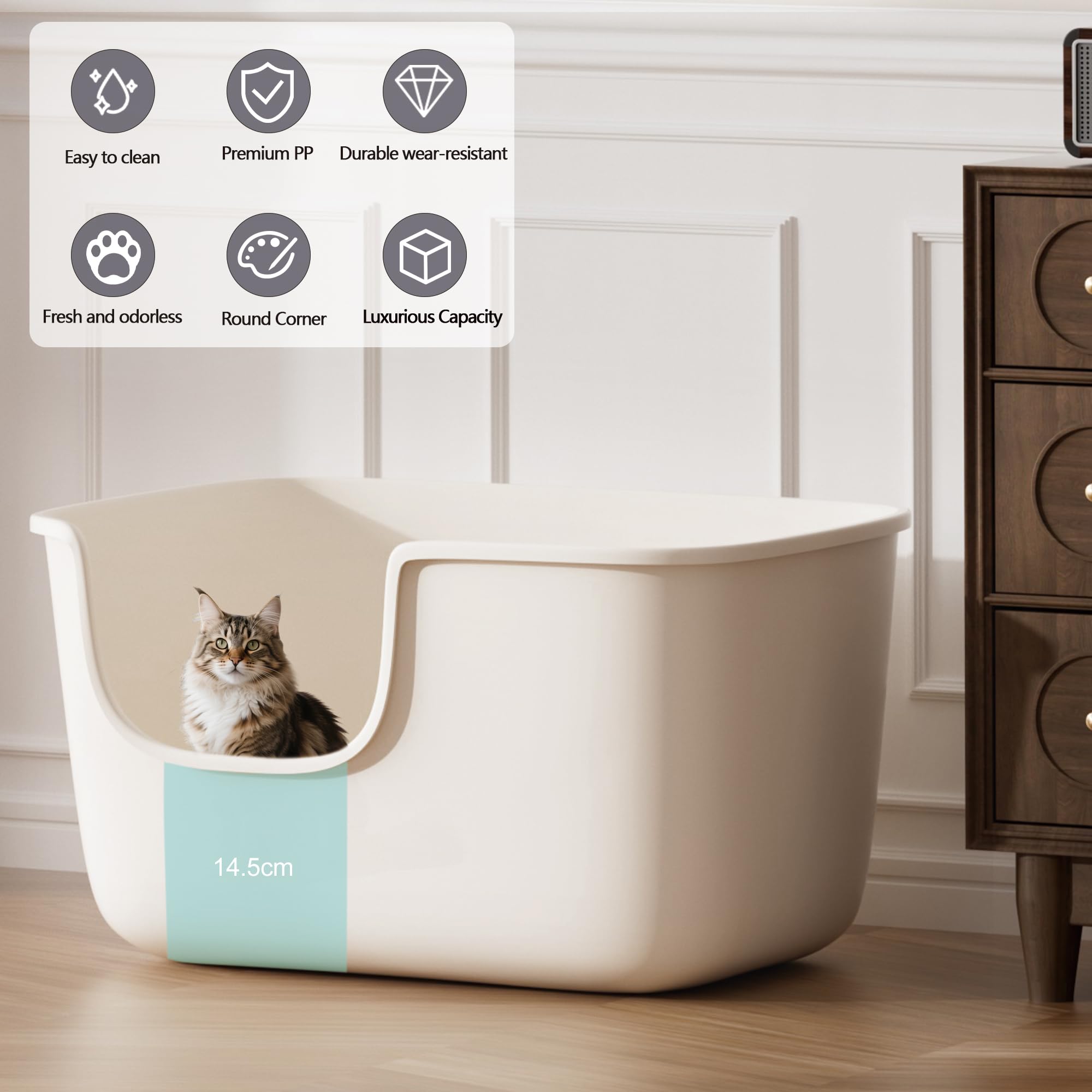 Also, dieses Vealind Katzenklo ist einfach der Hammer für alle, die mehrere Stubentiger zu Hause haben! Mit riesigen 56x41x31cm ist es so geräumig, dass selbst die größten Katzen bequem Platz finden. Der niedrige Einstieg von nur 14,5cm ist perfekt für Kätzchen, ältere oder bewegungseingeschränkte Katzen - die kommen ohne Probleme rein und raus. Die hohen Seitenwände verhindern, dass Streu oder schlimmeres daneben geht. Und das offene Design ist super praktisch: Du siehst sofort, wann sauber gemacht werden muss und kannst ohne Deckel-Ärger schnell reinigen. Die Oberfläche innen ist superglatt, da bleibt nichts kleben! Noch ein cooles Feature: Der integrierte Griff, den man kaum sieht - aber wenn du die Kiste bewegen musst, ist er einfach da. Aus stabilem, BPA-freiem PP-Material und in verschiedenen Farben erhältlich, passt es in jedes Zuhause. Und rundum abgerundete Ecken sorgen dafür, dass sich niemand wehtut. Einfach mal durchspülen - fertig! Wer mehrere Katzen hat, weiß ja: Je einfacher die Reinigung, desto besser!