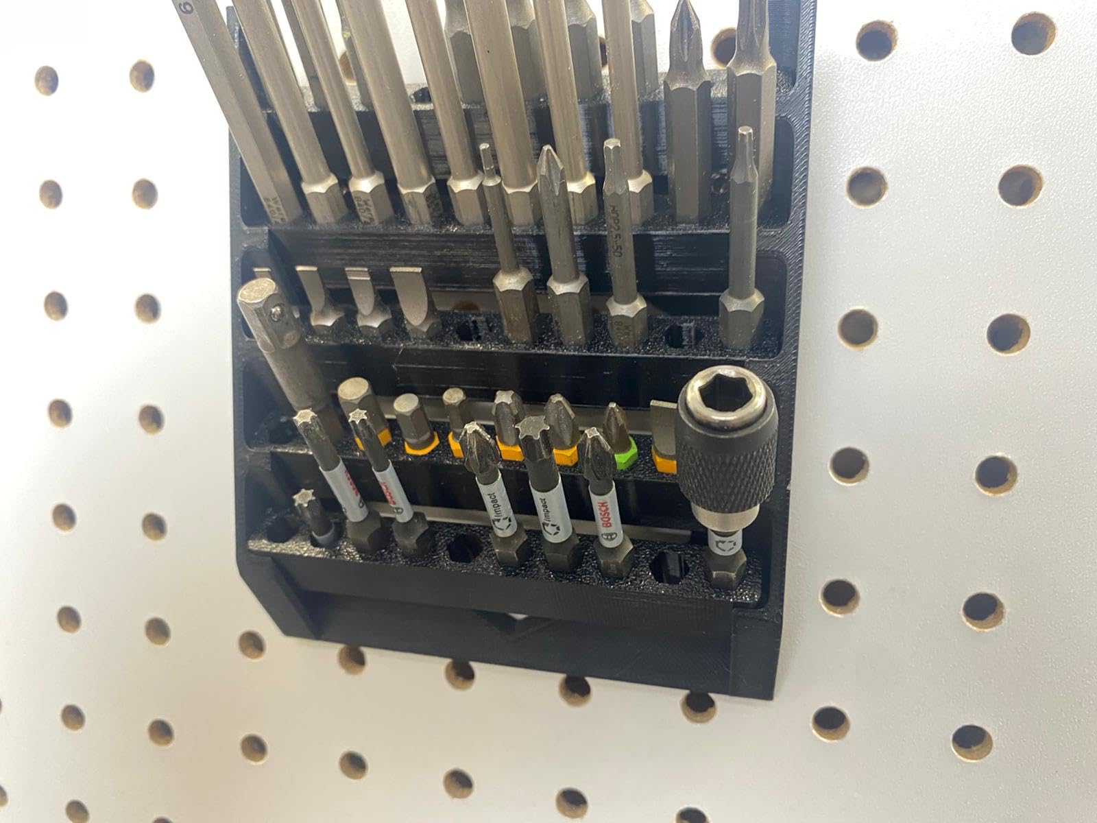 Ordnung im Werkzeugchaos? Dieser Bithalter für deine Pegboard-Lochwand hilft dir dabei! Mit Platz für satte 50 Bits, aufgeteilt auf 5 herausnehmbare Aufnehmer. So hast du immer den richtigen Bits griffbereit. Passt perfekt auf Standard-Pegboards mit 25,4mm Lochabstand und 7mm Lochung. Einfach einhängen - keine Montage nötig. Und das Beste: Hergestellt in Deutschland, in schwarzem Design. Nie wieder suchen, immer direkt loslegen. Ob in der Werkstatt oder der heimischen Werkzeugkiste - mit diesem Halter bist du bestens organisiert!