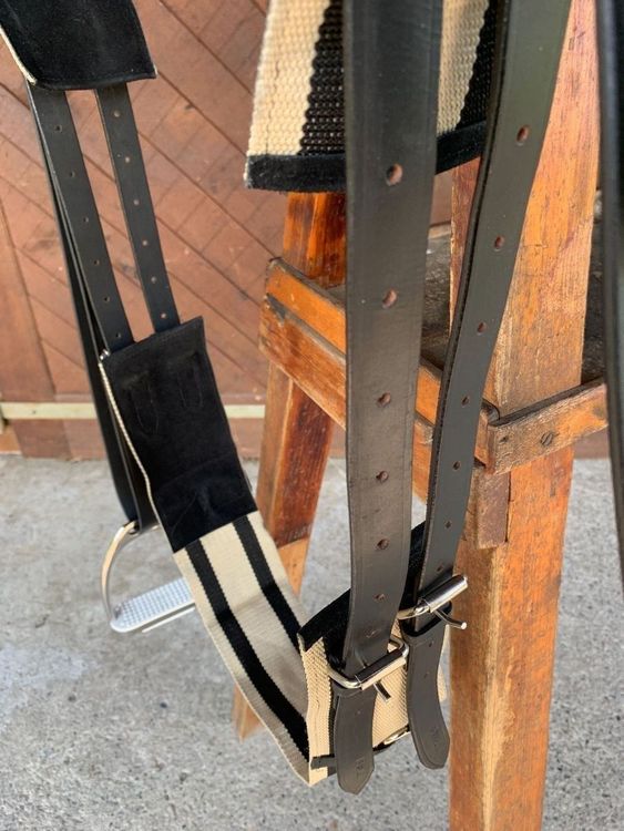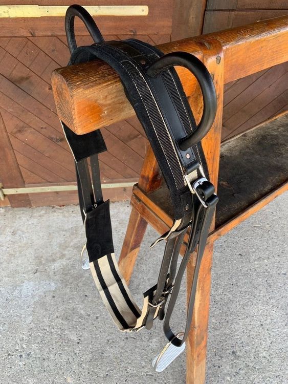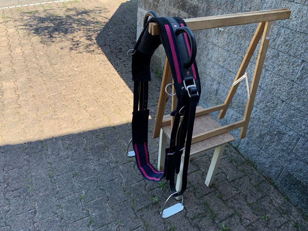 Sicherer Voltigierspaß für Kinder und Anfänger! Der Esposita Voltigiergurt aus echtem Leder bietet optimalen Halt beim Turnen auf dem Pferd. Mit zwei stabilen Metallgriffen die mit Leder überzogen sind - perfekt zum Festhalten! Beidseitige Beinschlaufen geben zusätzlichen Halt und können bei Nichtgebrauch weggeklappt werden. Extra breite Wirbelsäulenfreiheit - kein unangenehmes Zwicken fürs Pferd! Verstellbarer Bauchgurt für perfekten Sitz. Erhältlich in 5 Größen: Shetty (140-175cm), Pony (165-200cm), VB/Cob (185-225cm), WB/Full (200-250cm) und KB/XFull. Mit Metallringen für Hilfszügel. Hochwertige Verarbeitung für lange Freude - ob im Verein, Therapie oder zu Hause am Holzpferd!