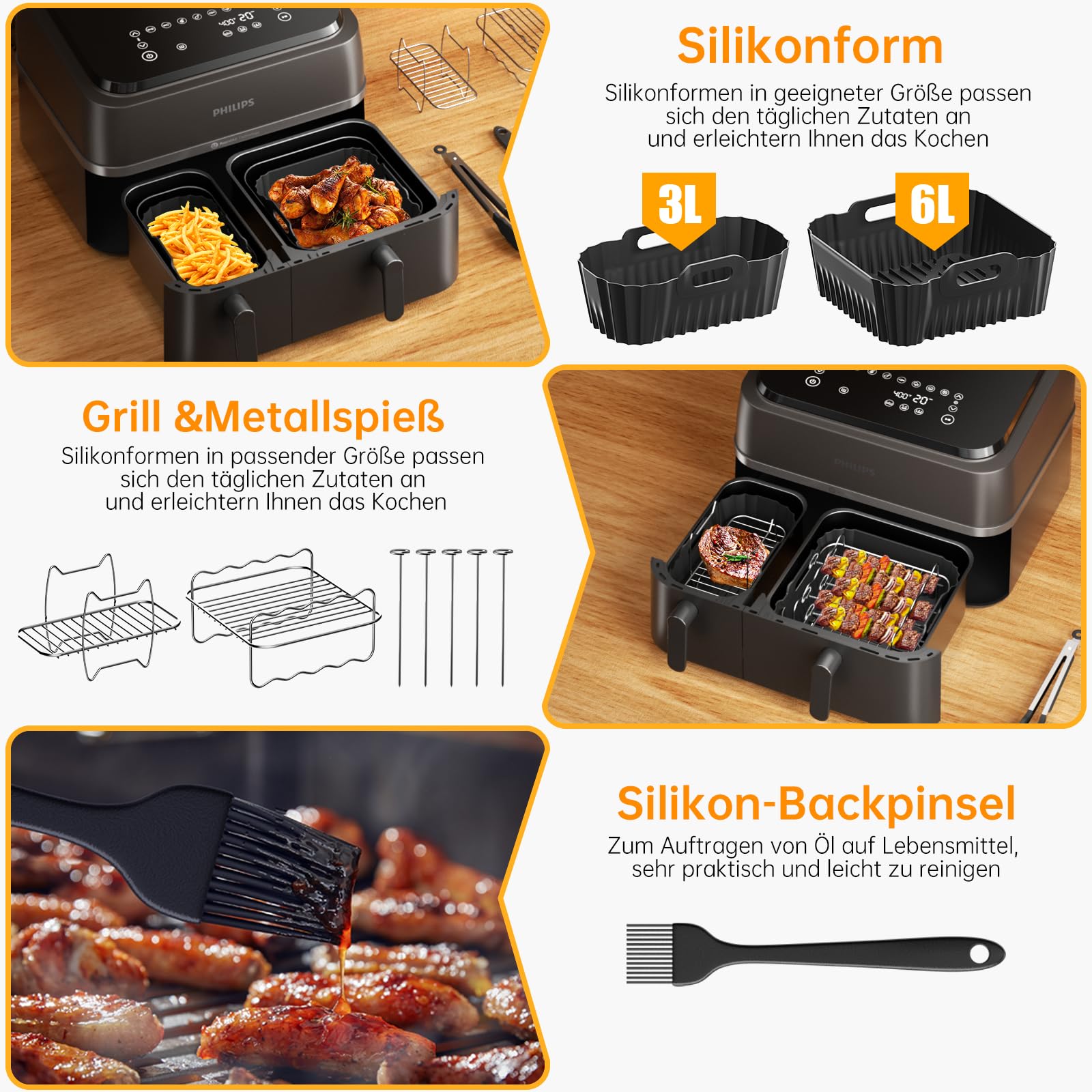 Wow, dieses 23-teilige Zubehör-Set macht deinen Philips Airfryer noch vielseitiger! Speziell für die Dual Basket 3000/5000 Serie - passt perfekt für NA350, NA550 Modelle. Enthält alles was du brauchst: Silikonformen für Cupcakes und Kuchen, Waffeleinsätze, Grillrost aus Edelstahl und sogar Spieße! Alles aus lebensmittelechtem Silikon, hitzebeständig bis 220°C. Bessere Luftzirkulation für knusprigere Ergebnisse. Super einfach zu reinigen - spülmaschinengeeignet! Verwandele deine Heißluftfritteuse in eine komplette Küchenstation. Ob Backen, Grillen oder Waffeln machen - mit diesem Set geht alles!