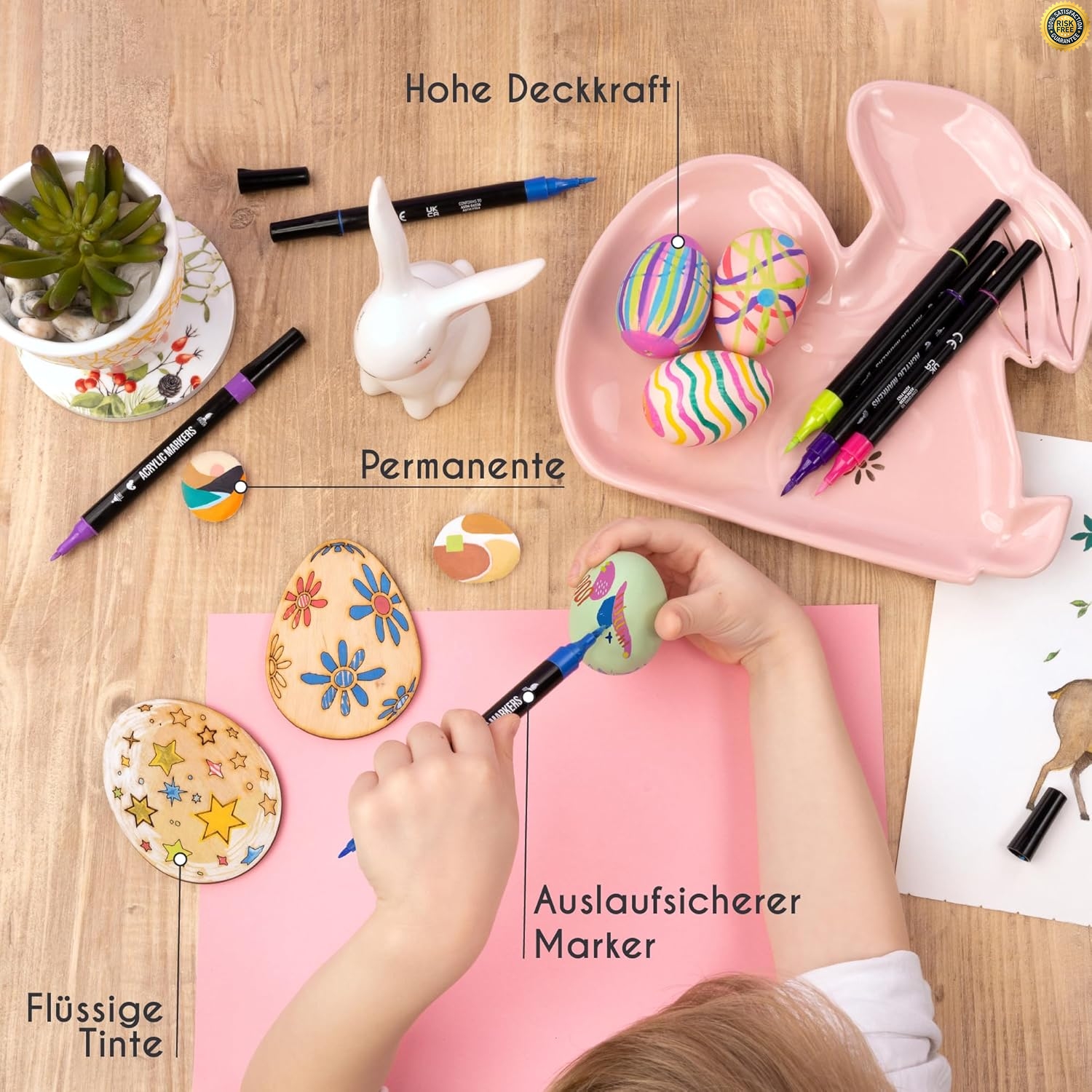 Macht mal richtig Spaß - mit diesen 24 bunten Acrylstiften kannst du Steine, Holz, Keramik und vieles mehr bemalen! Das geniale Doppelspitzen-Design hat eine feine Spitze (0,5-1mm) für detailierte Linien und eine dicke Rundspitze (3-5mm) für kräftige Flächen und coole Punkte-Muster. Die Farben sind hochpigmentiert, wasserfest und UV-beständig - deine Kunstwerke bleiben also ewig schön! Besonders praktisch: Sie trocknen in nur 2 Minuten und verschmieren nicht. Sogar Metallic-Farben in Gold und Silber sind dabei für besondere Akzente. Die Stifte sind wasserbasiert, geruchsneutral und sicher für Kinder. Einfach aufschrauben und loslegen - perfekt für Mandala-Malerei, Handlettering, Ostereier bemalen oder Gartensteine verschönern!