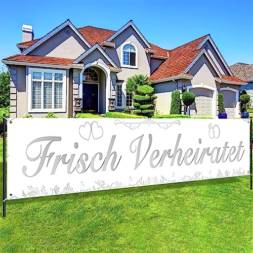 Romantische Atmosphäre für euren großen Tag! Dieses 'Just Married'-Banner aus weichem Polyester (145x60 cm) verwandelt jeden Raum in eine Traumhochzeit. Mit süßen Motiven wie Rosen, Ringen und dem Brautpaar-Duo sieht es einfach hinreißend aus. Die vier Kupferlöcher und das mitgelieferte Seil machen das Aufhängen super einfach - ob an der Tür, an der Wand oder im Garten. Die Farben sind kräftig gedruckt und das Banner bleibt lange als schöne Erinnerung erhalten. Perfekt nicht nur für die Hochzeitsfeier, sondern auch für Brautduschen, Junggesellinnenabschiede oder als Foto-Requisite. Deine Gäste werden begeistert sein! Dieses Banner schafft sofort Hochzeitsstimmung und sieht auf Fotos einfach fantastisch aus. Ein Must-have für jedes frisch vermählte Paar!