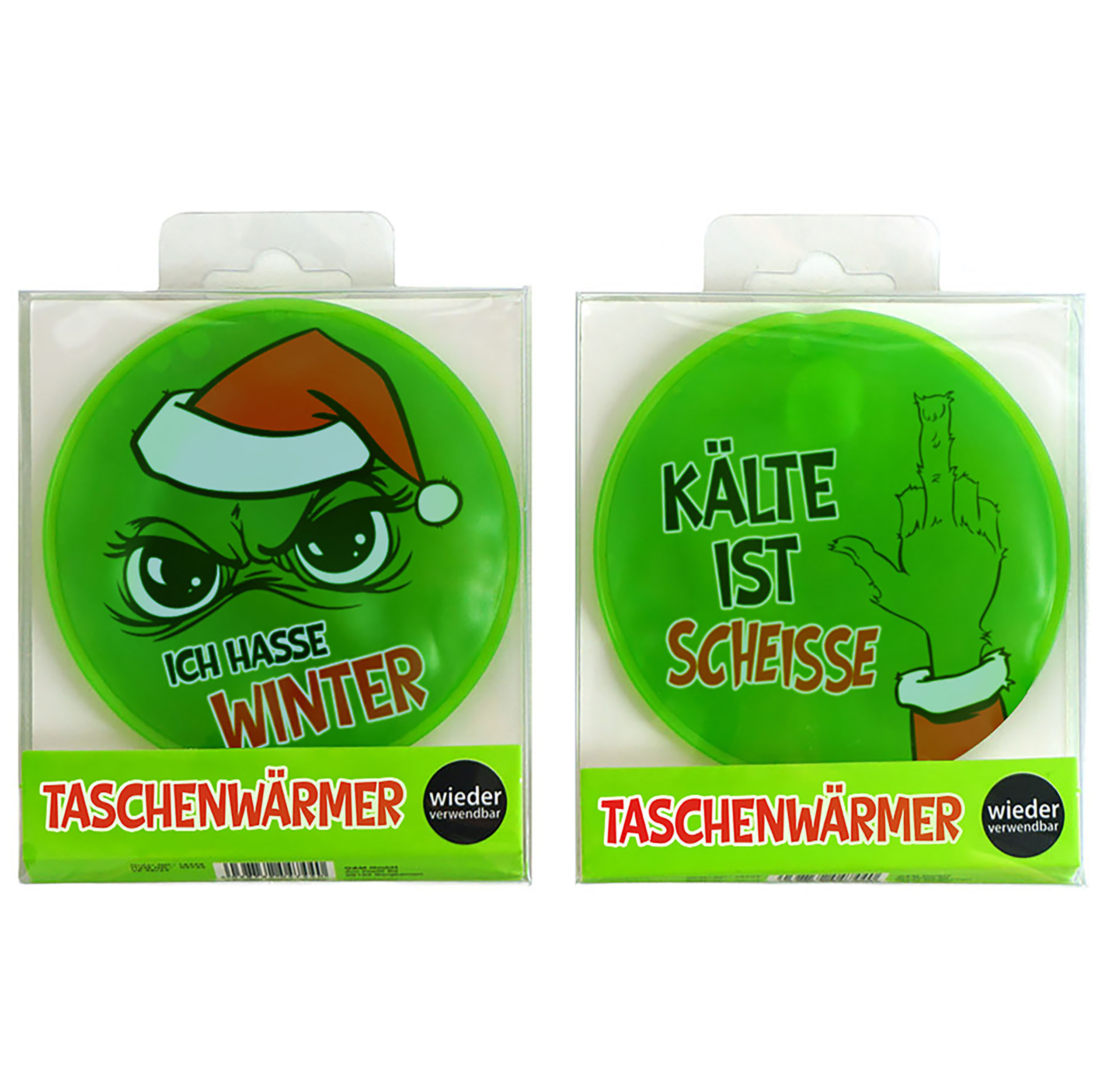 Endlich Taschenwärmer für alle, die Winter und Kälte nicht abkönnen! Die Teile sind einfach genial: Einfach das Metallplättchen knicken und schon werden sie warm. Und das Beste: Du kannst sie bis zu 1000 Mal wiederverwenden! Einfach in heißes Wasser legen und sie sind wieder einsatzbereit. Mit den frechen Sprüchen 'Ich hasse Winter' und 'Kälte ist Scheiße' in knalligem Giftgrün sind sie nicht nur praktisch, sondern auch ein richtiger Hingucker. Ob beim Winterspaziergang, im Stadion oder einfach nur zu Hause auf dem Sofa - mit diesen Handwärmern bleibst du garantiert warm. Aus hochwertigem Kunststoff, 8,5 cm Durchmesser. Perfekt für alle, die sich über die kalte Jahreszeit beschweren wollen, aber trotzdem nicht frieren möchten!
