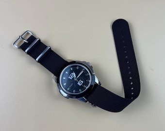 Stylisches Nylon-Armband im James Bond-Look! Passt auf Uhren mit 20mm oder 22mm Bandbreite - ideal für Seiko, Mido und andere Marken. Das ergonomische Design liegt super bequem am Handgelenk und kann den ganzen Tag getragen werden. Vielseitiger Stil - passt zu lässigen wie auch zu formellen Outfits. Schlankes, minimalistisches Design unterstreicht die Ästhetik deiner Uhr. Verstellbarer Verschluss passt sich jeder Handgelenkgröße an. Sichere Befestigung - die Uhr bleibt auch bei Aktivitäten sicher am Platz. Aus umweltfreundlichem Nylon, Gummi und Silikon - angenehm weich und hautfreundlich. Einfach zu montieren und zu entfernen. Perfektes Geschenk für Uhrenfans! One size fits all - passt praktisch jedem. Einfach das alte Band wechseln und neuen Style genießen!