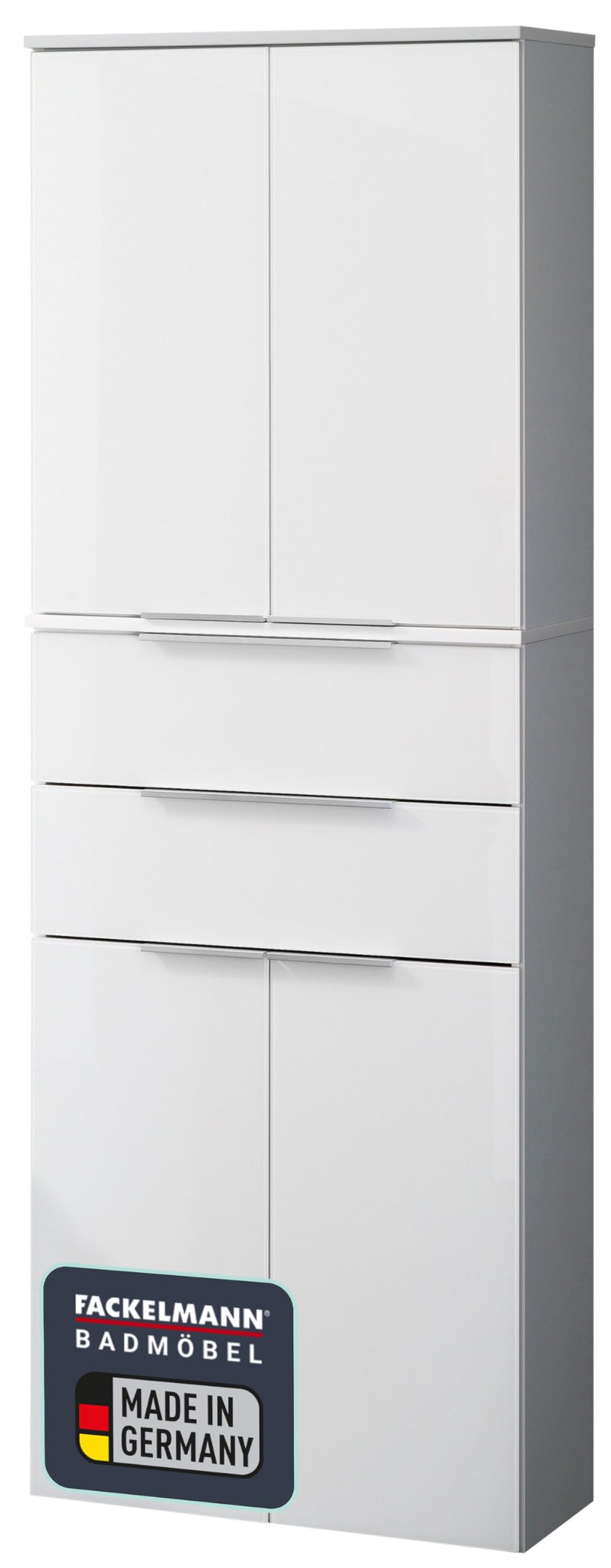 Der Kara Unterschrank von FACKELMANN ist perfekt für dein Bad! Mit 80cm Breite, 59cm Höhe und 49cm Tiefe passt er unter fast jedes Waschbecken. Die zwei Schubladen haben dieses super Soft-Close-System - klappen ganz leise zu, ohne Rumms! Front ist aus weiß lackiertem Glas - sieht super modern aus und ist easy zu reinigen. Korpus in weiß matt. Und das Beste: Kommt schon vormontiert! Musst nur noch reinstellen und befestigen. Made in Germany - Qualität die man kennt. Die chromfarbene Griffleiste gibt dem ganzen noch den letzten Schliff. Stil ist puristisch und modern - passt in jedes Badezimmer. Inklusive Raumsparsiphon. Einfach messen, bestellen und dein Bad sieht aus wie neu!