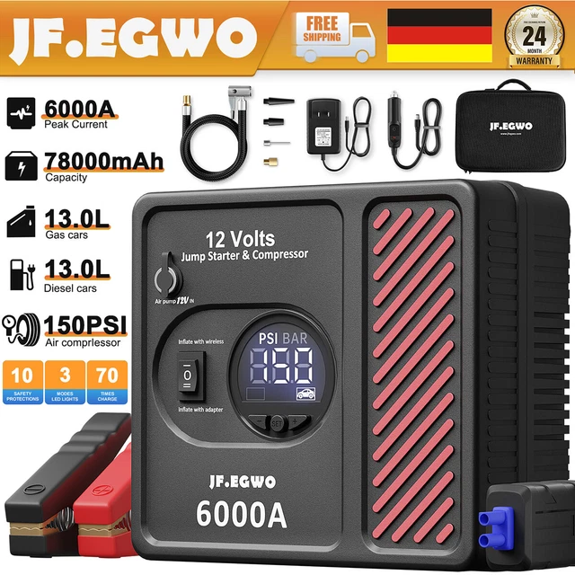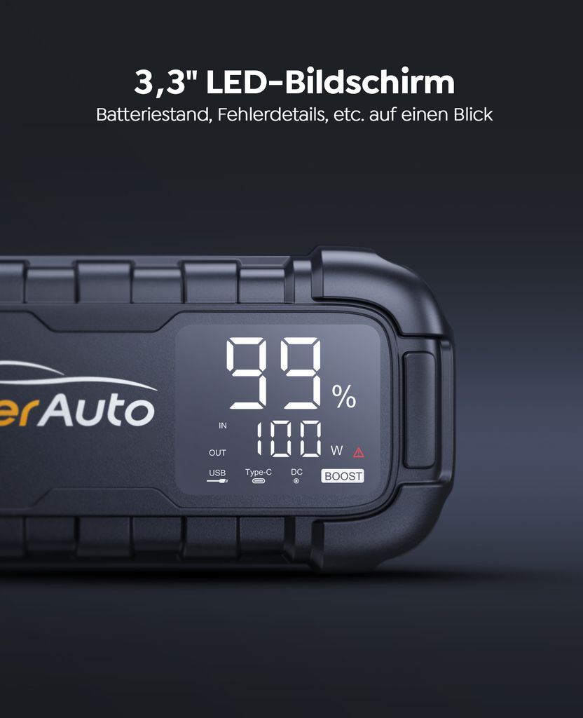 Diese Powerbank ist der ultimative Retter in der Not! 6000A Startstrom - bringt auch leere Batterien wieder zum Leben. 26800mAh Kapazität - bis zu 60 Starts pro Ladung. Für alle Benziner und Diesel bis 10 Liter. Integrierte Luftpumpe mit 150PSI - pumpt Reifen in Minuten auf. 9 Funktionen in einem: Starthilfe, Luftpumpe, Taschenlampe, SOS, Stroboskop, Powerbank. Großes 2,4 Zoll Display - alles gut ablesbar. 10-facher Schutz - absolut sicher in der Anwendung. Funktioniert von -20°C bis 60°C - auch im Winter zuverlässig. Einfach ein Muss für jedes Auto!