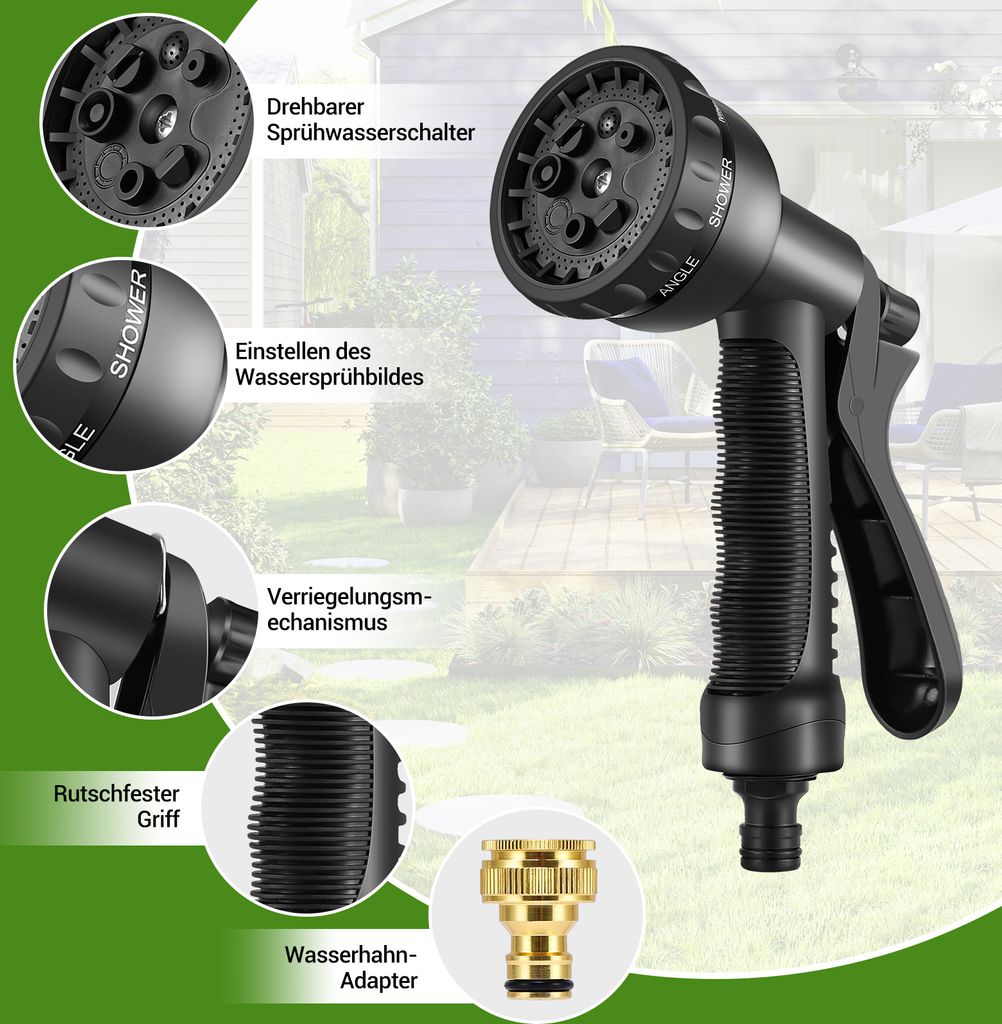 Boah, dieser Gartenschlauch von FUMETAX ist echt praktisch! Dehnbar von 5 auf 15 Meter - wenn du Wasser aufdrehst, wächst er wie von Zauberhand. Und wenn du fertig bist, zieht er sich wieder zusammen. Super platzsparend! Die Reinigungsspritze hat 7 verschiedene Sprüh-Muster: Jet, Flach, Dusche, Nebel und mehr. Spart dir bis zu 50% Wasser! Perfekt für Gartenbewässerung, Autowaschen, Haustierreinigung oder einfach nur zum Spielen. Korrosionsbeständig und mit dichten Anschlüssen - keine lästigen Leckagen mehr. Macht Gartenarbeit richtig Spaß!