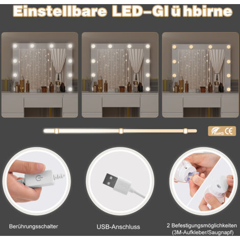 Wow, dieser FUSOU Schminktisch ist einfach traumhaft! Mit 12 dimmbaren LED-Lampen rund um den Spiegel hast du perfektes Licht für dein Make-up - egal ob kaltes, natürliches oder warmes Licht. Einfach den Schalter gedrückt halten und die Farbe anpassen. Und dann der Stauraum: 11 Schubladen! Drei mittig für Schmuck und acht große für all deine Kosmetik-Sachen. Die Glasplatte oben drauf sieht nicht nur edel aus, sondern zeigt dir deine Lieblingsstücke auf einen Blick. Noch praktischer: Eingebaute Steckdose mit 2 USB-Anschlüssen! Perfekt für Haartrockner, Glätteisen und zum Laden von Handy & Co. Der mitgelieferte Hocker mit PU-Leder ist super bequem und passt nach Gebrauch platzsparend unter den Tisch. Ob für dich selbst oder als Geschenk - dieser Schminktisch macht einfach glücklich! Einfach aufbauen und sich wie ein Star fühlen beim Schminken!