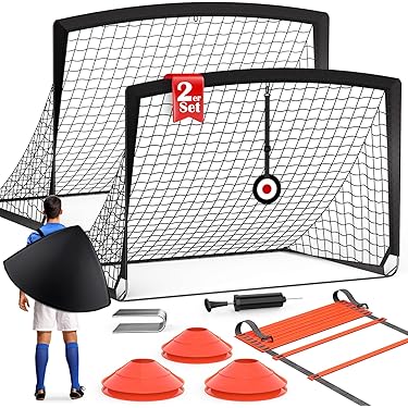 Dieses Fußballtor-Set ist der Hit für alle Nachwuchs-Kicker! Im Set: 2 faltbare Tore, 6 Hütchen, 2 Ballzielscheiben, Koordinationsleiter und Aufbewahrungstasche. Aus stabilen Fiberglasstangen mit robusten Netzen - hält auch intensivem Spiel stand. 20 Bodenhaken für extra Stabilität - auch bei Wind sicher stehend. Werkzeugloser Aufbau - in wenigen Minuten spielbereit. Die Tragetasche macht Transport und Lagerung super einfach. Perfekt für Garten, Park oder Bolzplatz - überall einsetzbar. Die Koordinationsleiter und Hütchen verbessern die Fußballskills. Ideal für Kindergeburtstage, Training oder einfach zum Spaß haben. Einfach aufbauen, Tor aufstellen und loskicken - mehr Fußball-Spaß geht nicht!