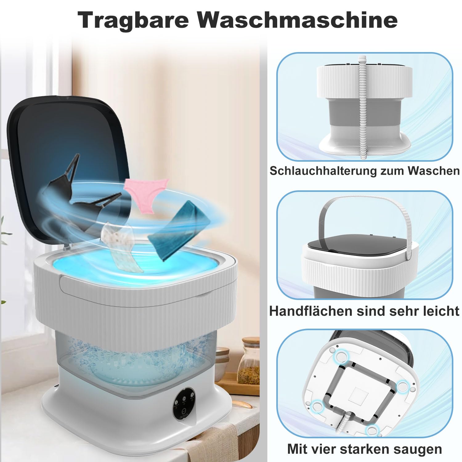 Boah, diese Mini-Waschmaschine ist einfach genial für alle die wenig Platz haben! Mit 12 Liter Fassungsvermögen perfekt für Unterwäsche, Socken, Babykleidung oder Handtücher. Komplett faltbar - wenn sie nicht gebraucht wird, nimmt sie kaum Platz weg. Halbautomatische Bedienung mit 3 Reinigungsmodi - super einfach zu bedienen. Aus robustem ABS-Material und lebensmittelecht - absolut sicher für deine Wäsche. Der geräuschreduzierte Motor ist mega leise, verbraucht wenig Strom und Wasser. Perfekt für kleine Wohnungen, Wohnheime, Camping oder Wohnmobil-Reisen. Einfach aufklappen, Wäsche rein, Programm warten - und schon ist alles frisch und sauber! Mit integriertem Spin-Trockner wird die Wäsche sogar noch vorgeschleudert. Einfach ein praktischer Helfer für alle die nicht immer die große Maschine anwerfen wollen. Damit hast du immer frische Wäsche, egal wo du bist!