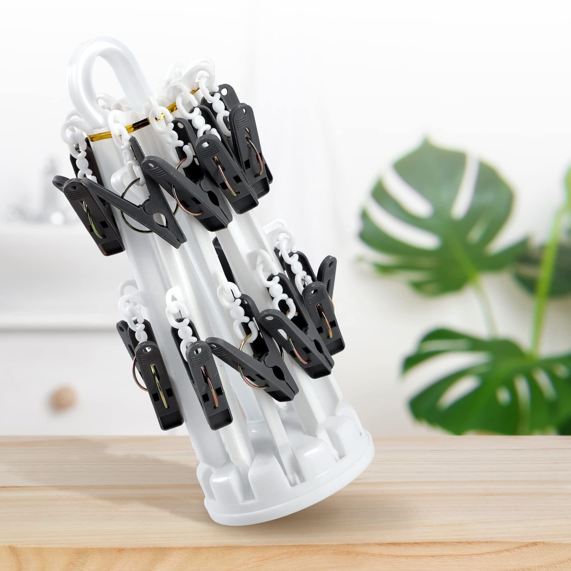 Endlich Ordnung beim Wäschetrocknen! Dieser praktische Sockentrockner mit 32 Clips hält alle kleinen Teile sicher fest. Einfach an der Wäscheleine, Duschstange oder im Schrank aufhängen. Das 360° drehbare Design ermöglicht optimalen Luftzugang von allen Seiten. Super platzsparend - zusammengeklappt nur 32x18cm groß! Perfekt für Socken, Unterwäsche, BHs, Masken und Babykleidung. Die rutschfesten Zähne an den Clips halten sicher ohne Spuren zu hinterlassen. Ideal für kleine Wohnungen, Camping oder Reisen. Leicht und robust aus PP-Kunststoff - hält lange. Macht das Wäschetrocknen viel organisierter! Nie wieder suchen nach dem zweiten Socken - alles hat seinen Platz. Ein echter Game-Changer für jeden Haushalt!