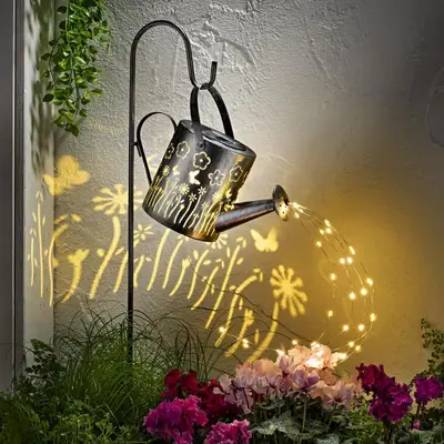 Wie magisch! Diese Solar-Gießkanne lässt keine Wassertropfen, sondern bunt glitzernde LEDs aus dem Ausguss fließen. Ein echter Hingucker für deinen Garten! Sobald es dämmrig wird, startet automatisch die farbenwechselnde Lichtshow - ganz ohne Stromkabel.