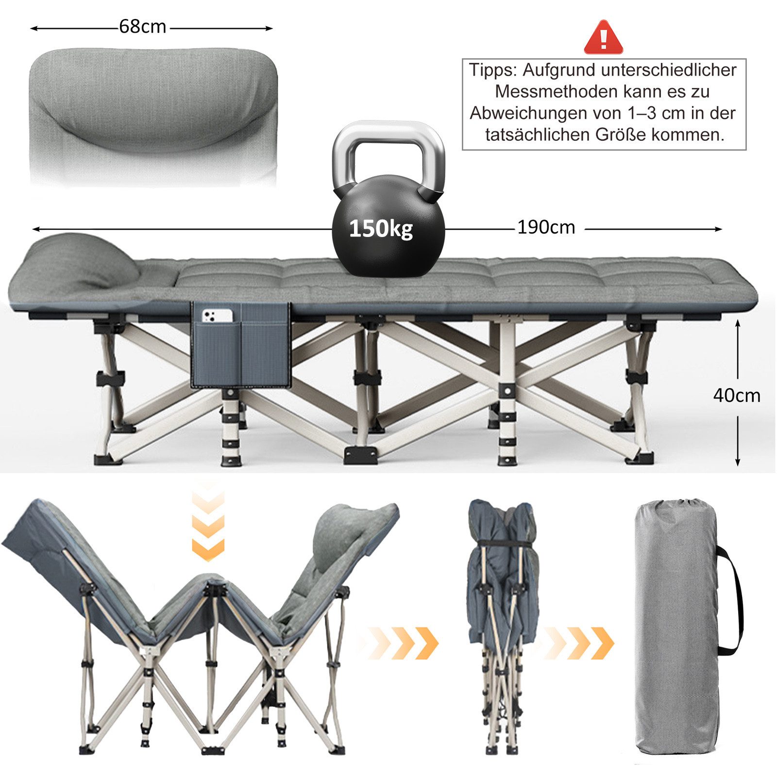 Bequeme Nachtruhe beim Camping! Dieses CALIYO Feldbett ist schnell auf- und abgebaut. Maße: 188x66x37cm, Kopfteil auf 49cm verstellbar. Bis 200kg belastbar aus Stahlrohr und Oxford-Stoff. Mit herausnehmbarer Perlbaumwoll-Matratze die waschbar ist. Rutschfeste Füße für sicheren Stand. Inklusive Tragetasche für platzsparende Aufbewahrung. Perfekt für Camping, Festivals, Gästezimmer oder Wohnmobil. Ergonomisches Design stützt Rücken und Beine. Viel komfortabler als Luftmatratzen. Macht Outdoor-Übernachtungen zum Erlebnis!
