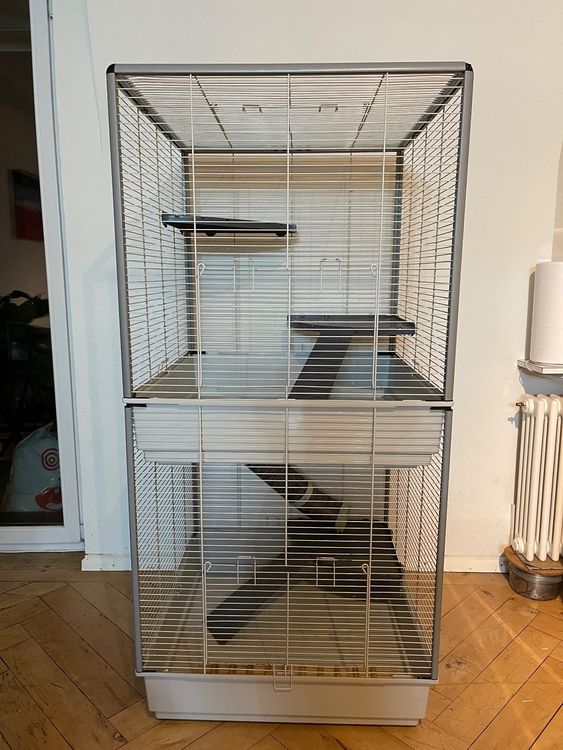 Für alle Rattenfans: Dieser Ferplast Jenny Käfig ist einfach perfekt für deine Nager! Mit 80x50x79,5cm (BxTxH) haben deine Ratten genug Platz zum Klettern, Spielen und Ausruhen. Die stabilen Gitter und praktischen Etagen nutzen den Bewegungsdrang der Tiere optimal aus. Die Kunststoffschale ist super einfach zu reinigen - kein lästiges Schrubben mehr! Ferplast ist ne richtig gute Marke aus Italien, die seit Jahren Qualitätszubehör für Haustiere herstellt. Der graue Käfig sieht schick aus und ist robust verarbeitet. Mit über 50 Jahren Erfahrung weiß Ferplast genau, was Tiere brauchen. Ob für Ratten, Mäuse oder andere kleine Nager - dieser Käfig bietet alles fürs Wohlbefinden deiner Tiere. Einfach aufbauen, einrichten und deine Ratten werden sich pudelwohl fühlen. Perfekte Größe für 2-4 Ratten und platzsparend genug für die meisten Wohnungen.