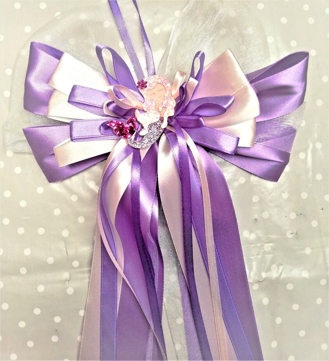 Die perfekte Deko für den großen Tag der Einschulung! Diese wunderschöne Meerjungfrau-Schleife kommt schon fertig gebunden - kein langes Gefummel mit Bändern mehr. Aus zartem Organza und glänzendem Satin in Lavendel- und Hellblautönen, verziert mit funkelnden Muschelperlen. In der Mitte glitzert ein Meerjungfrauenschwanz mit Seestern - einfach magisch! Mit 40x20 cm passt sie perfekt auf jede Schultüte und macht sie zum absoluten Hingucker. Einfach auspacken und auf die Zuckertüte binden - fertig ist die Traumdekoration. Nicht nur für die Einschulung super, sondern auch für Mottopartys, Geburtstage oder als besonderes Geschenk. Dein Kind wird strahlen, wenn es diese einzigartige Schleife auf der Schultüte entdeckt!