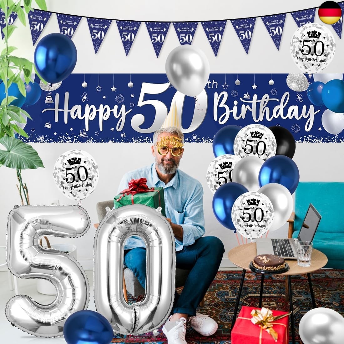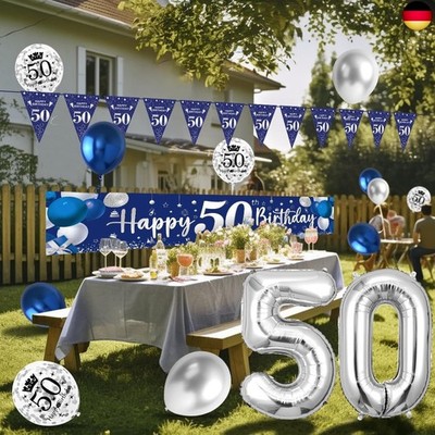 Fesnova Girlande 50 Geburtstag | Blau & Silber Banner | Party Deko