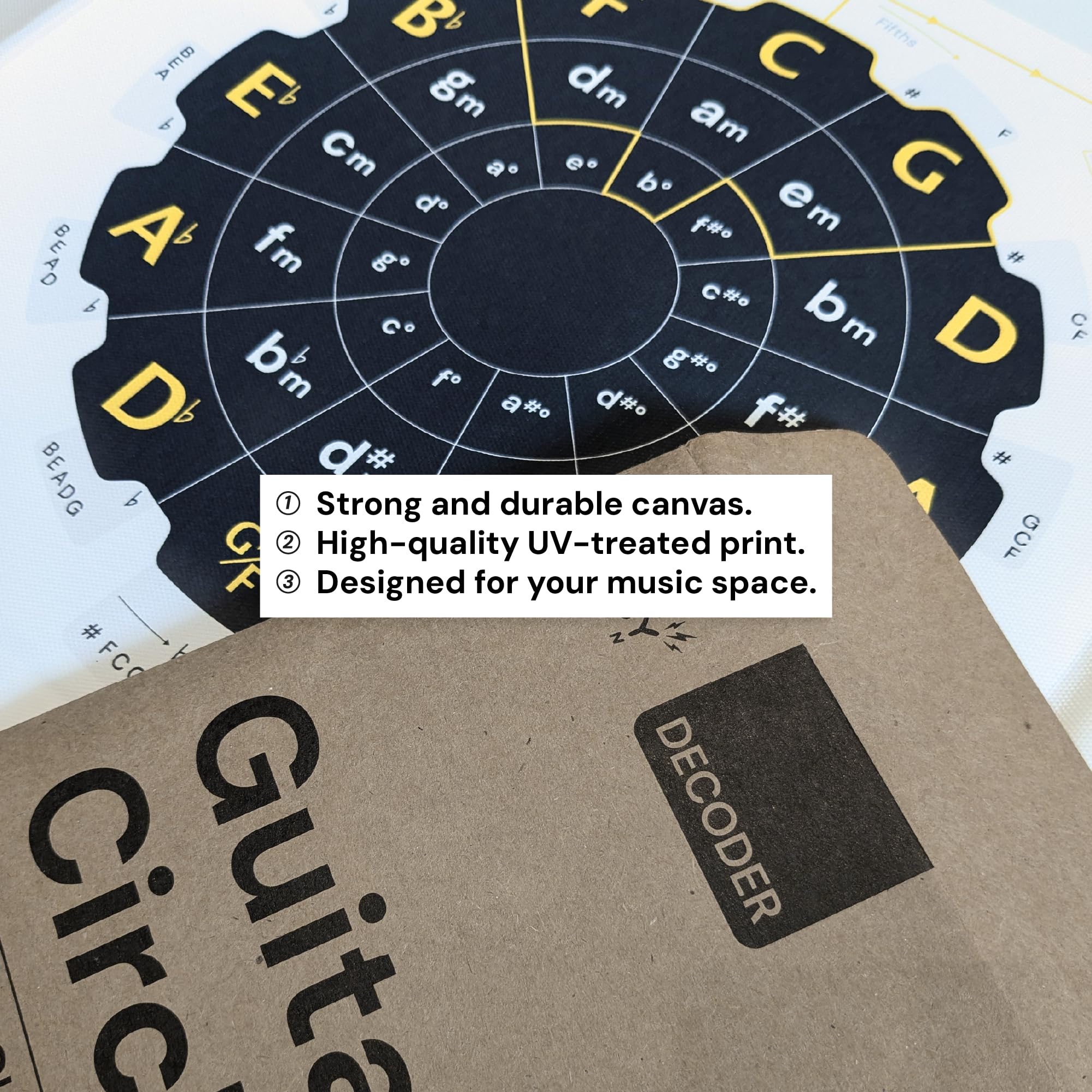 Der ultimative Cheat-Code für Musiker! Dieses riesige Musiktheorie-Poster (89x61cm) zeigt den Circle of Fifths auf einen Blick - dein Schlüssel zum erfolgreichen Musizieren. Nie wieder unsicher sein, welche Akkorde in welcher Tonart passen!\\n\\nDas klare Gitarren-Griffbrett-Design macht das Üben zum Kinderspiel. Sieh sofort, welche Akkorde du in C-Dur, G-Dur oder jeder anderen Tonart spielen musst. Perfekt für Gitarristen und Pianisten gleichermaßen.\\n\\nVorteile:\\n- Schreibe Songs wie ein Profi\\n- Spiele sicher in jeder Tonart\\n- Transponiere Songs mühelos\\n- Lerne Musiktheorie visuell\\n- Ideal für Band-Proben und Jam-Sessions\\n\\nDruckqualität:\\n- Hochwertige Leinwand mit matter Laminierung\\n- Hohe Auflösung für beste Lesbarkeit\\n- Faltenfrei - einfach bügeln bei Bedarf\\n- Langlebig und robust\\n\\nEinsatzbereiche:\\n- Übungsraum und Musikzimmer\\n- Unterricht und Musikschule\\n- Home-Studio und Proberaum\\n- Als Geschenk für Musiker\\n\\nVon Noisy Clan entwickelt - spezialisiert auf Musikzubehör, das einfach Spaß macht!\\n\\nHole dir dieses Poster und meistere die Musiktheorie - dein Spiel wird sich sofort verbessern!