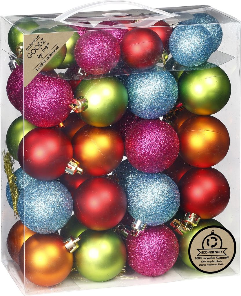 Weihnachtszeit ist Kugelzeit! Mit diesen 50 bunten Christbaumkugeln im Mille-Fiori-Design machst du deinen Weihnachtsbaum zum absoluten Hingucker. Die verspielten Muster in allen Farben bringen sofort Festtagsstimmung ins Haus.\\n\\nAus bruchfestem Kunststoff - perfekt wenn Kinder oder Haustiere mit im Haus sind. Keine Angst mehr vor runterfallenden Kugeln! Mit den passenden Aufhängekordeln sind sie sofort einsatzbereit.\\n\\nIm Set enthalten:\\n• 18 Kugeln Ø 4 cm\\n• 32 Kugeln Ø 6 cm\\n• Alle mit Aufhängekordeln\\n• Verpackt in praktischer Plastik-Box\\n\\nSuper nicht nur für den Christbaum, sondern auch für:\\n• Türkränze\\n• Fensterdekoration\\n• Bastelprojekte\\n• Geschenkverpackungen\\n\\nEinfach auspacken, aufhängen und dich an der wunderschönen Weihnachtsdeko erfreuen. Auch ein tolles Geschenk für Freunde und Familie, die Weihnachten lieben!
