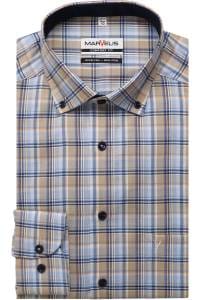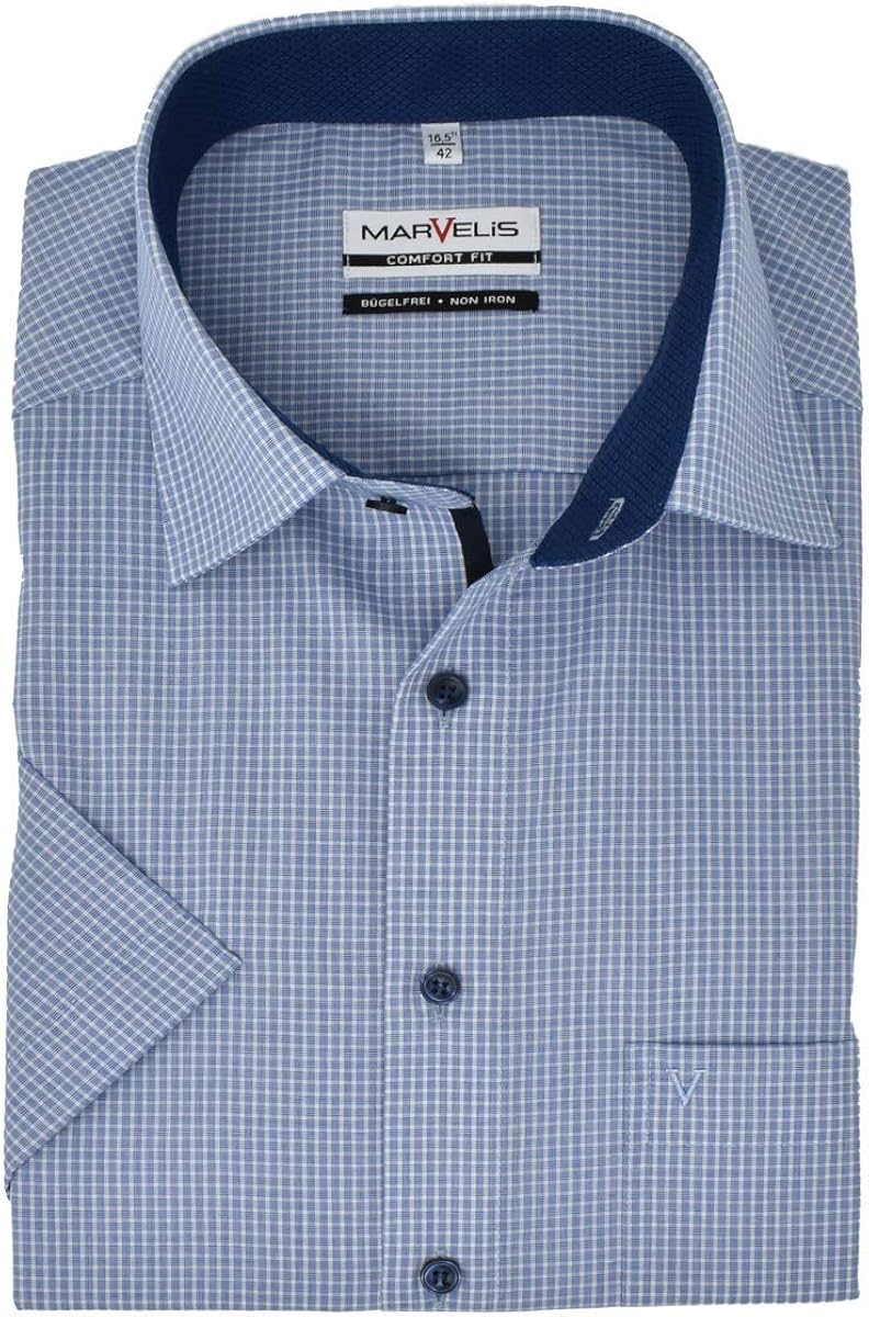 Perfekt für den Büro-Alltag ohne Bügelstress! 👔 Dieses Marvelis Hemd im bequemen Comfort Fit sitzt lässig-weit und macht einfach eine gute Figur. Aus eleganter Popeline-Qualität, die nicht nur super atmungsaktiv ist, sondern auch Feuchtigkeit super aufsaugt - du fühlst dich den ganzen Tag frisch und comfortable.\n\nDas Beste: Es ist wirklich bügelfrei! Einfach waschen, aufhängen zum Trocknen und schon kannst du es wieder anziehen. Kein lästiges Bügeln mehr am frühen Morgen. Die verstellbaren Office-Manschetten mit 2 Knöpfen geben dir die perfekte Passform am Handgelenk.\n\nMit der bestickten Brusttasche und dem klassischen 'V'-Stick sieht es einfach professionell aus. Und das Wichtigste: Schadstoffgeprüft nach Öko-Tex Standard 100, also absolut hautverträglich und unbedenklich.\n\nOb im Meeting, beim Kunden oder nach Feierabend - dieses Hemd in den trendigen Karo-Mustern (blau, grün, lila) ist dein zuverlässiger Begleiter. Marvelis steht für top Qualität zum fairen Preis - probier's aus!