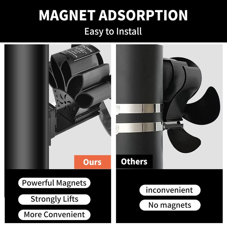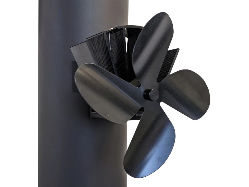 Die 4 Flügel aus Aluminium sind super leicht und drehen sich fast lautlos (nur 35 dB). Einfach mit dem Magnetfuß am Rauchrohr befestigen - mindestens 20 cm über der Feuerquelle. Passt auf Rohre von 12-20 cm Durchmesser.